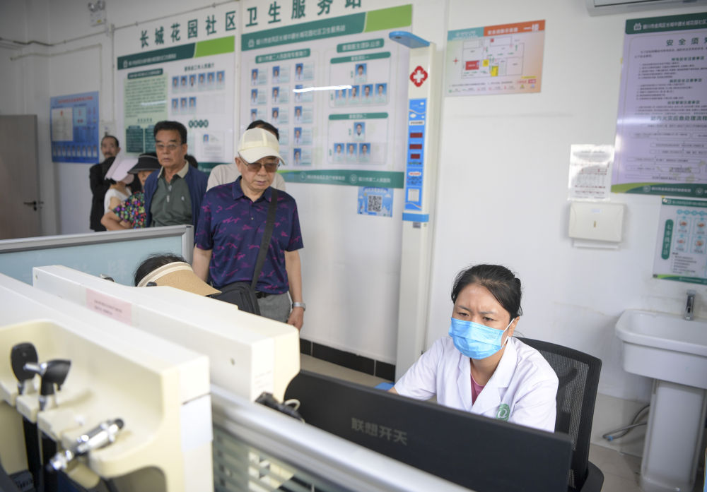 6月20日,長城花園社區(qū)衛(wèi)生站的工作人員為居民登記醫(yī)療信息。
