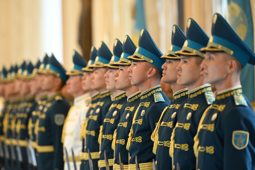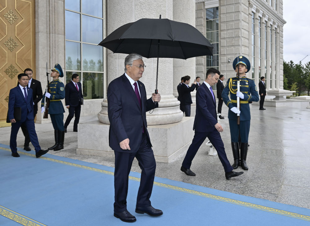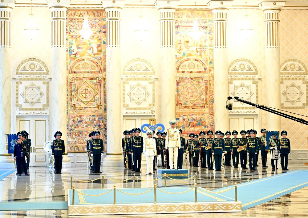 托卡耶夫?yàn)榱?xí)近平舉行隆重歡迎儀式??偨y(tǒng)府大廳氣勢(shì)恢宏,禮兵威武挺拔。兩國元首分別同對(duì)方陪同人員一一握手致意。兩國元首登上檢閱臺(tái),軍樂團(tuán)奏中哈兩國國歌。習(xí)近平在托卡耶夫陪同下檢閱儀仗隊(duì)。