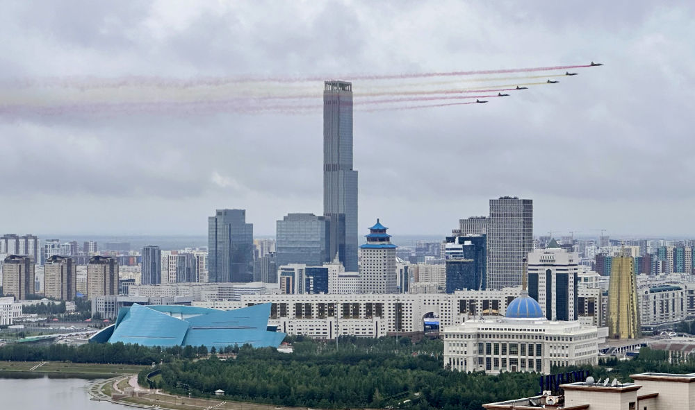 當(dāng)?shù)貢r(shí)間7月3日,國家主席習(xí)近平在阿斯塔納出席哈薩克斯坦總統(tǒng)托卡耶夫舉行的歡迎儀式。習(xí)近平乘車抵達(dá)總統(tǒng)府時(shí),托卡耶夫總統(tǒng)熱情迎接。六架哈薩克斯坦空軍戰(zhàn)機(jī)從總統(tǒng)府上空飛過,拉出象征中國國旗的紅黃色彩煙,以最高禮儀歡迎習(xí)近平對(duì)哈薩克斯坦進(jìn)行國事訪問。