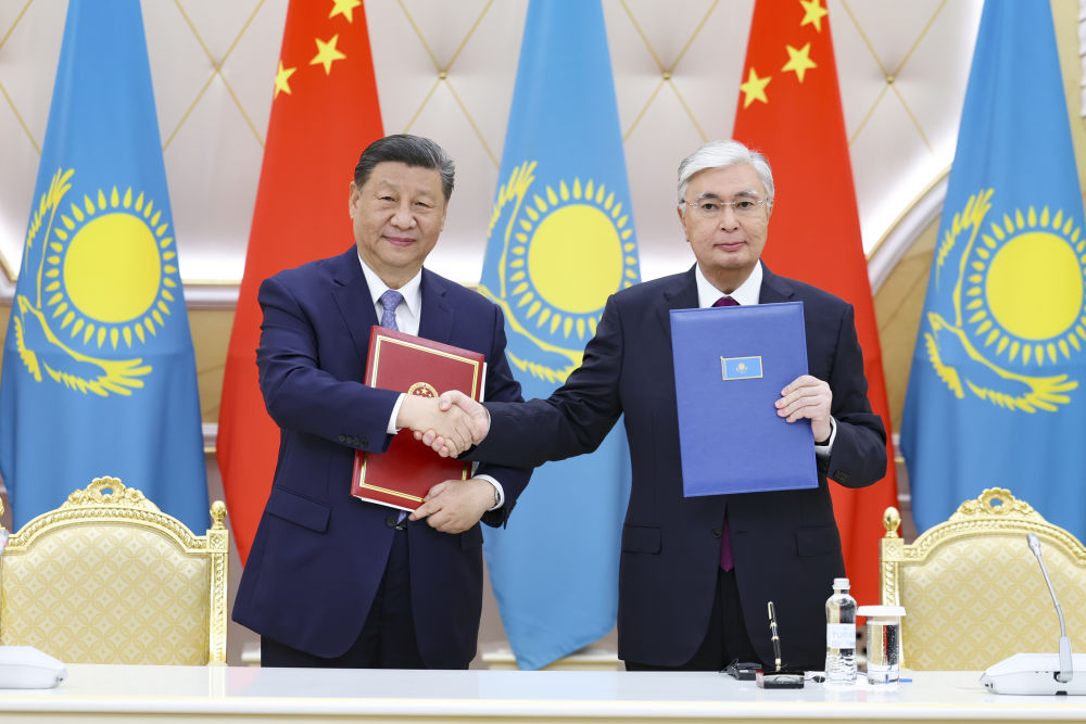 兩國元首共同簽署《中華人民共和國和哈薩克斯坦共和國聯(lián)合聲明》,并共同見證交換經(jīng)貿(mào)、互聯(lián)互通、航空航天、教育、媒體等領(lǐng)域數(shù)十項(xiàng)雙邊合作文件。