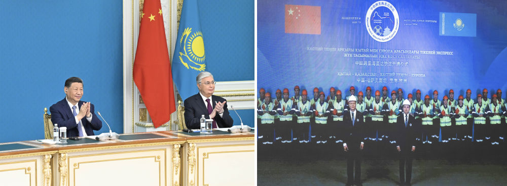 中午,習(xí)近平同托卡耶夫在阿斯塔納總統(tǒng)府以視頻方式共同出席中歐跨里海直達(dá)快運(yùn)開通儀式。哈方項(xiàng)目負(fù)責(zé)人向兩國元首匯報(bào)準(zhǔn)備情況,中方項(xiàng)目負(fù)責(zé)人請(qǐng)兩國元首下達(dá)指令。兩國元首共同下達(dá)作業(yè)指令:“啟運(yùn)!”兩國元首通過大屏幕觀看車輛登船、集裝箱裝船等實(shí)時(shí)情況。現(xiàn)場(chǎng)響起熱烈掌聲。