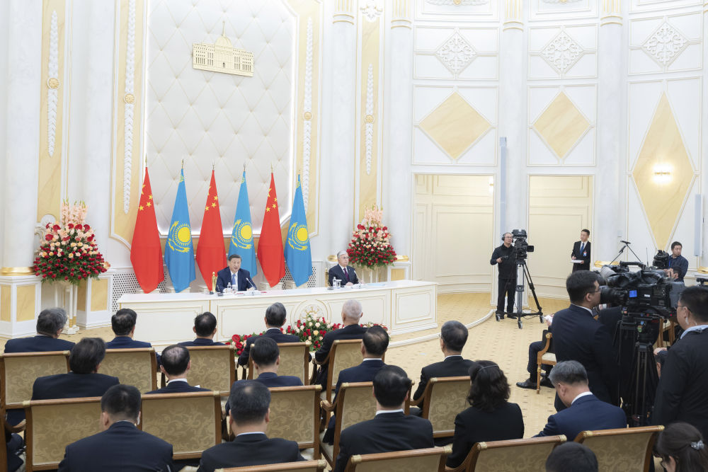 習(xí)近平在阿斯塔納總統(tǒng)府同托卡耶夫共同會(huì)見記者。
