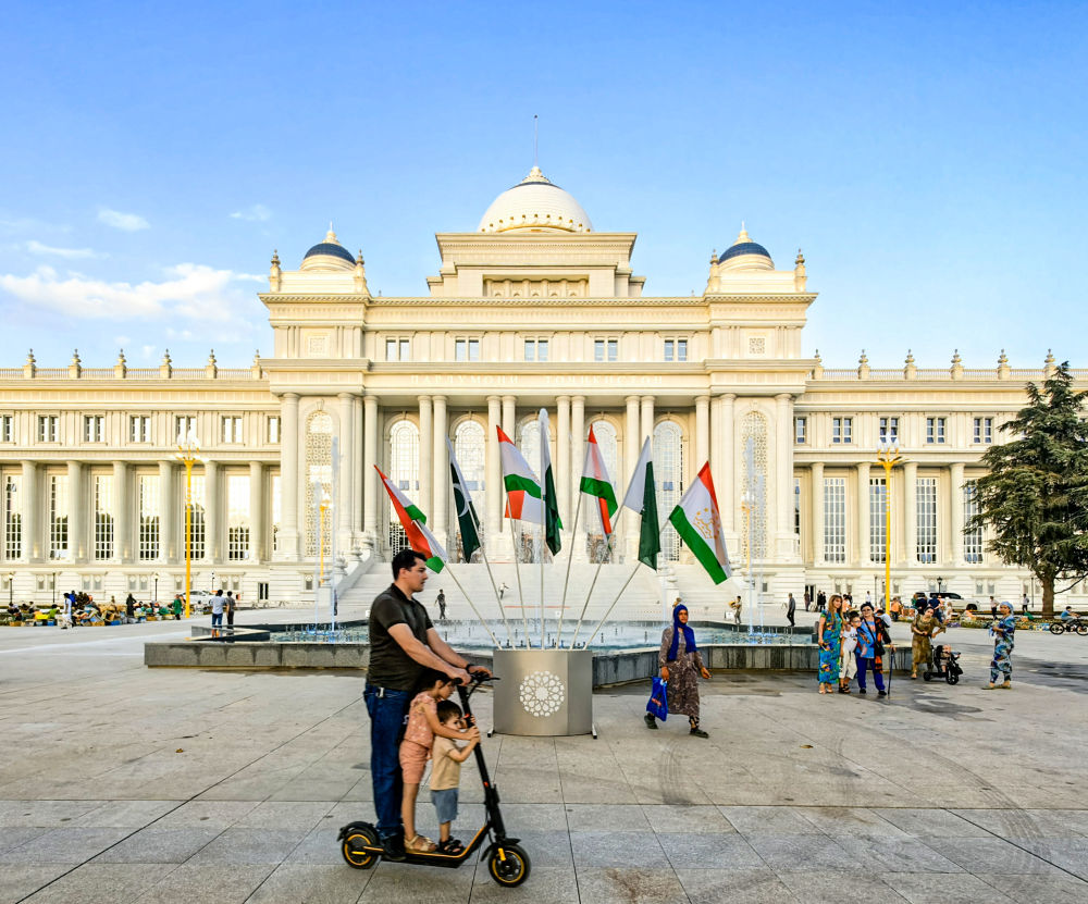2024年7月1日,人們在塔吉克斯坦議會(huì)大樓前的廣場上休閑。