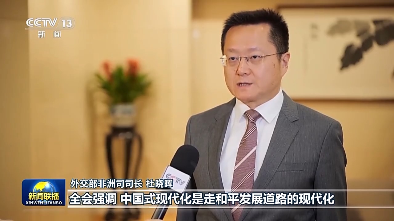 外交部非洲司司長 杜曉暉:全會強調,中國式現代化是走和平發(fā)展道路的現代化,開放是中國式現代化的鮮明標識。在百年變局加速演進、世界進入新的動蕩變革期的大背景下,三中全會給世界注入和平力量、穩(wěn)定力量、進步力量、發(fā)展力量。我們將以習近平外交思想為指引,堅定奉行獨立自主的和平外交政策,推動構建人類命運共同體,為以中國式現代化全面推進強國建設、民族復興偉業(yè)營造更有利國際環(huán)境、提供更堅實戰(zhàn)略支撐。