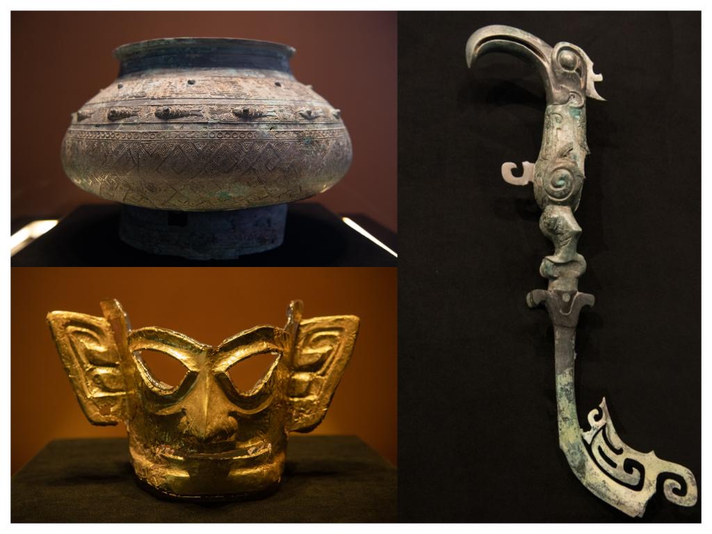 拼版照片:左上圖為青銅瓿,左下圖為黃金面具,右圖為青銅樹(shù)枝。新華社記者唐文豪 攝