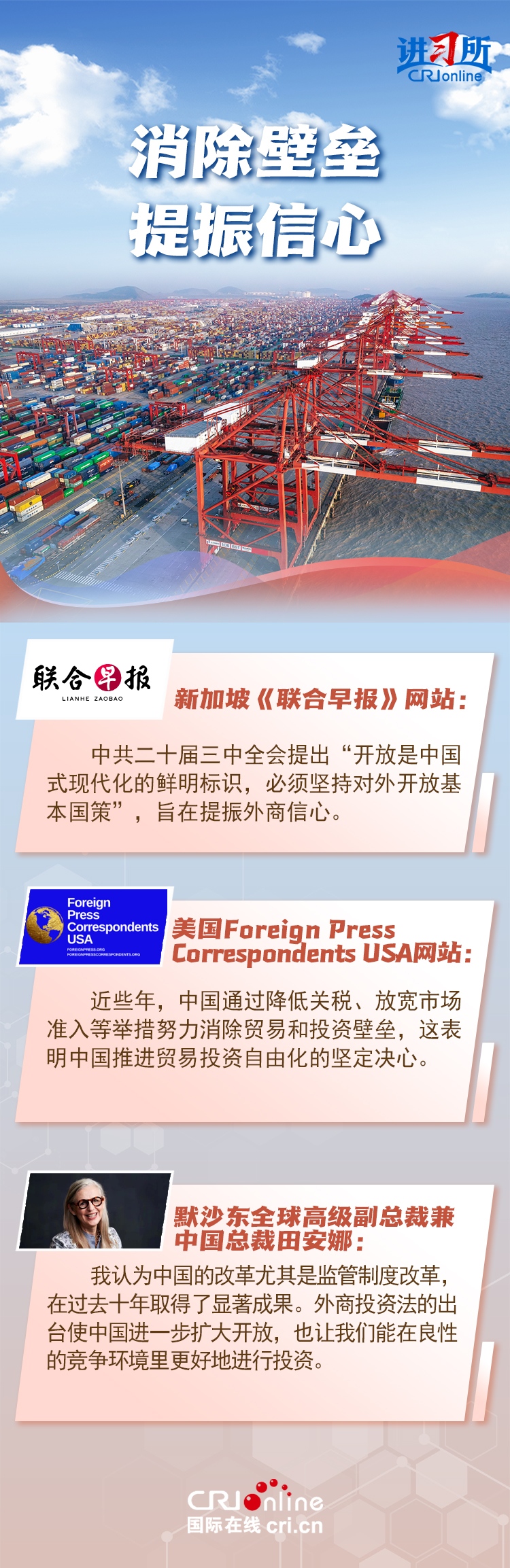 開放是中國式現(xiàn)代化的鮮明標(biāo)識,也是國際社會持續(xù)關(guān)注中國全面深化改革的重點(diǎn)所在。“優(yōu)化營商環(huán)境”“放寬市場準(zhǔn)入”“144小時過境免簽”……中國高水平對外開放,既有高屋建瓴的頂層設(shè)計,又有觸及民心的靈活實踐,給世界帶來信心與機(jī)遇。