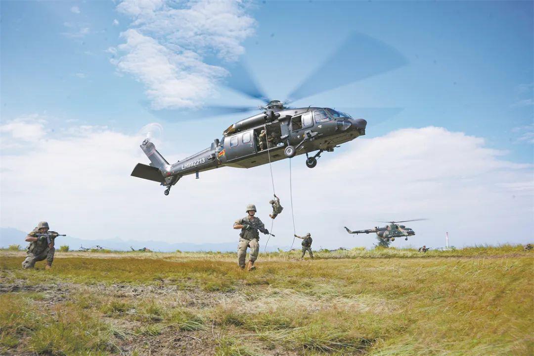 第72集團軍某旅某合成營官兵在陸航部隊配合下開展機降訓練。