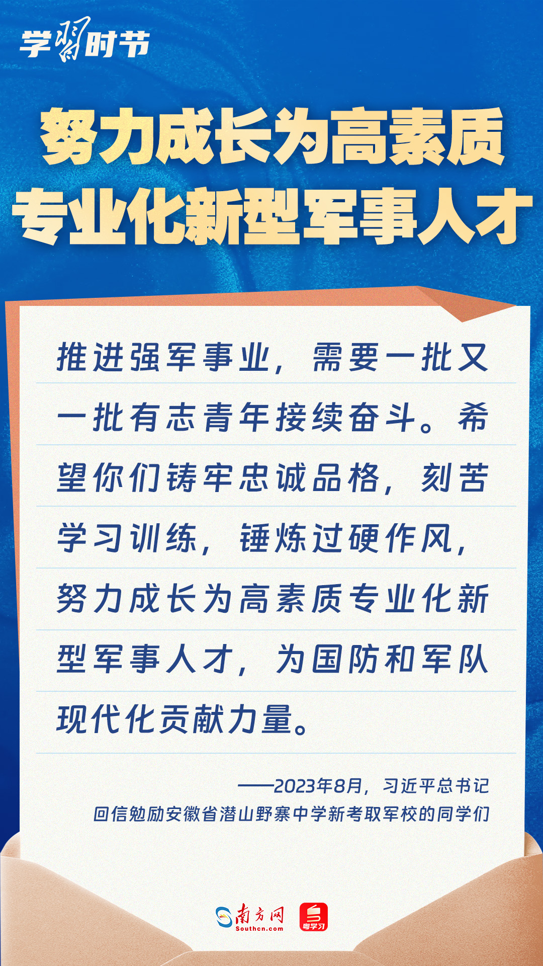 強(qiáng)國(guó)必須強(qiáng)軍,軍強(qiáng)才能國(guó)安。黨的十八大以來,習(xí)近平總書記始終牽掛一線官兵冷暖,高度重視我軍院校教育和人才培養(yǎng)工作,多次給部隊(duì)官兵、軍校學(xué)員等回信。讓我們一起重溫總書記的諄諄寄語!