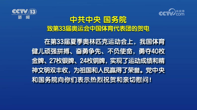 8月11日,中共中央、國務(wù)院向第33屆夏季奧運(yùn)會中國體育代表團(tuán)致賀電,高度評價(jià)我國體育健兒“實(shí)現(xiàn)了運(yùn)動成績和精神文明雙豐收,為祖國和人民贏得了榮譽(yù)”。賀電指出,我國體育健兒們以優(yōu)異成績和出色表現(xiàn),進(jìn)一步激發(fā)了海內(nèi)外中華兒女的愛國熱情、振奮了民族精神、凝聚了奮進(jìn)力量。