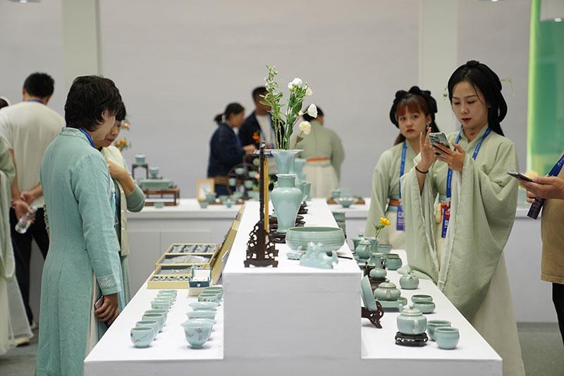 2023年10月18日,人們在2023中國景德鎮(zhèn)國際陶瓷博覽會(huì)汝窯展臺(tái)參觀。