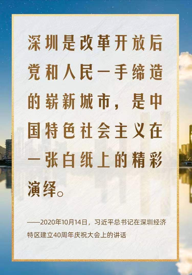 2020年10月,在慶祝深圳經(jīng)濟(jì)特區(qū)建立40周年之際,習(xí)近平總書記又一次來到這里,出席慶祝大會,強(qiáng)調(diào)改革不停頓、開放不止步,在更高起點(diǎn)上推進(jìn)改革開放,推動經(jīng)濟(jì)特區(qū)工作開創(chuàng)新局面。