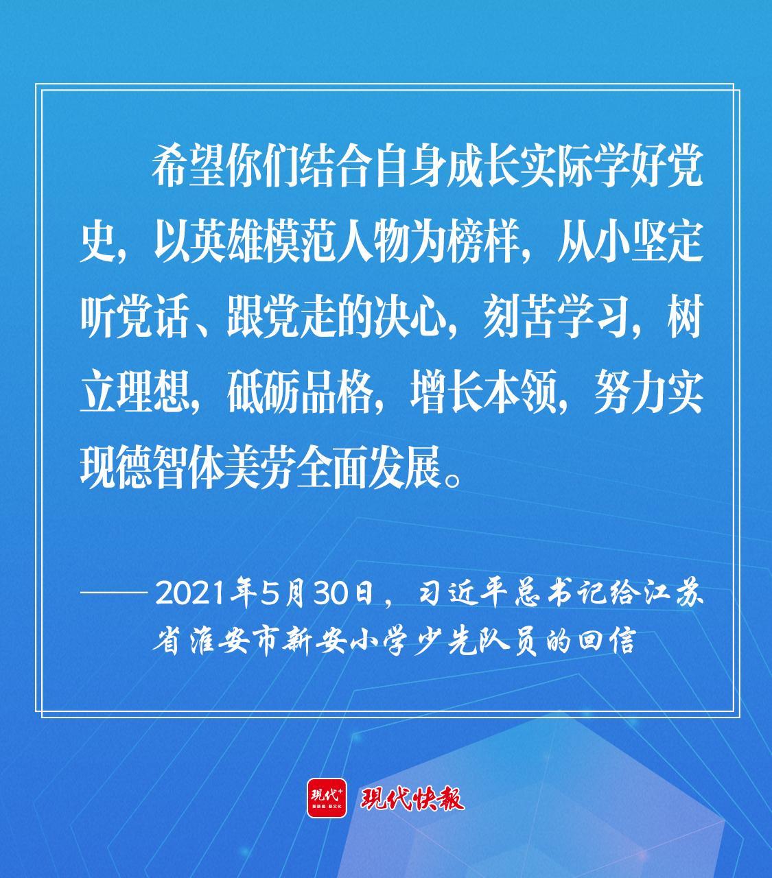 2021年5月30日,習(xí)近平總書記給江蘇省淮安市新安小學(xué)少先隊(duì)員回信時(shí)強(qiáng)調(diào),“希望你們結(jié)合自身成長(zhǎng)實(shí)際學(xué)好黨史,以英雄模范人物為榜樣,從小堅(jiān)定聽黨話、跟黨走的決心,刻苦學(xué)習(xí),樹立理想,砥礪品格,增長(zhǎng)本領(lǐng),努力實(shí)現(xiàn)德智體美勞全面發(fā)展。”