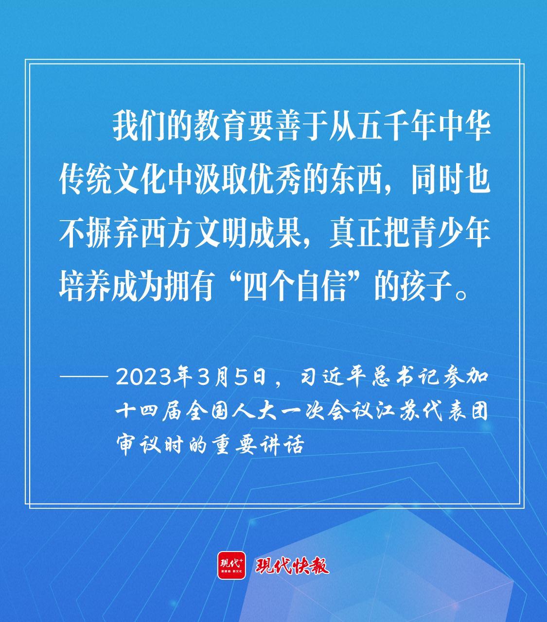 2023年3月5日,習(xí)近平總書記參加十四屆全國(guó)人大一次會(huì)議江蘇代表團(tuán)審議時(shí),勉勵(lì)教育工作者“要善于從五千年中華傳統(tǒng)文化中汲取優(yōu)秀的東西,同時(shí)也不摒棄西方文明成果,真正把青少年培養(yǎng)成為擁有‘四個(gè)自信’的孩子?!?/p>