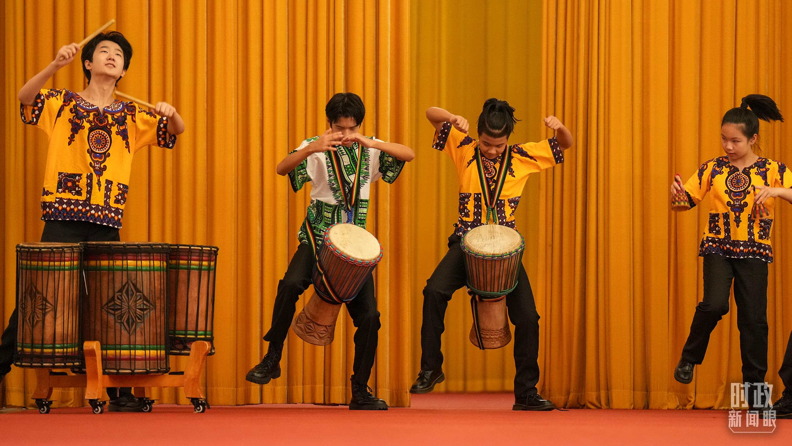 中國少年打起歡快的非洲鼓。(總臺記者李晉拍攝)