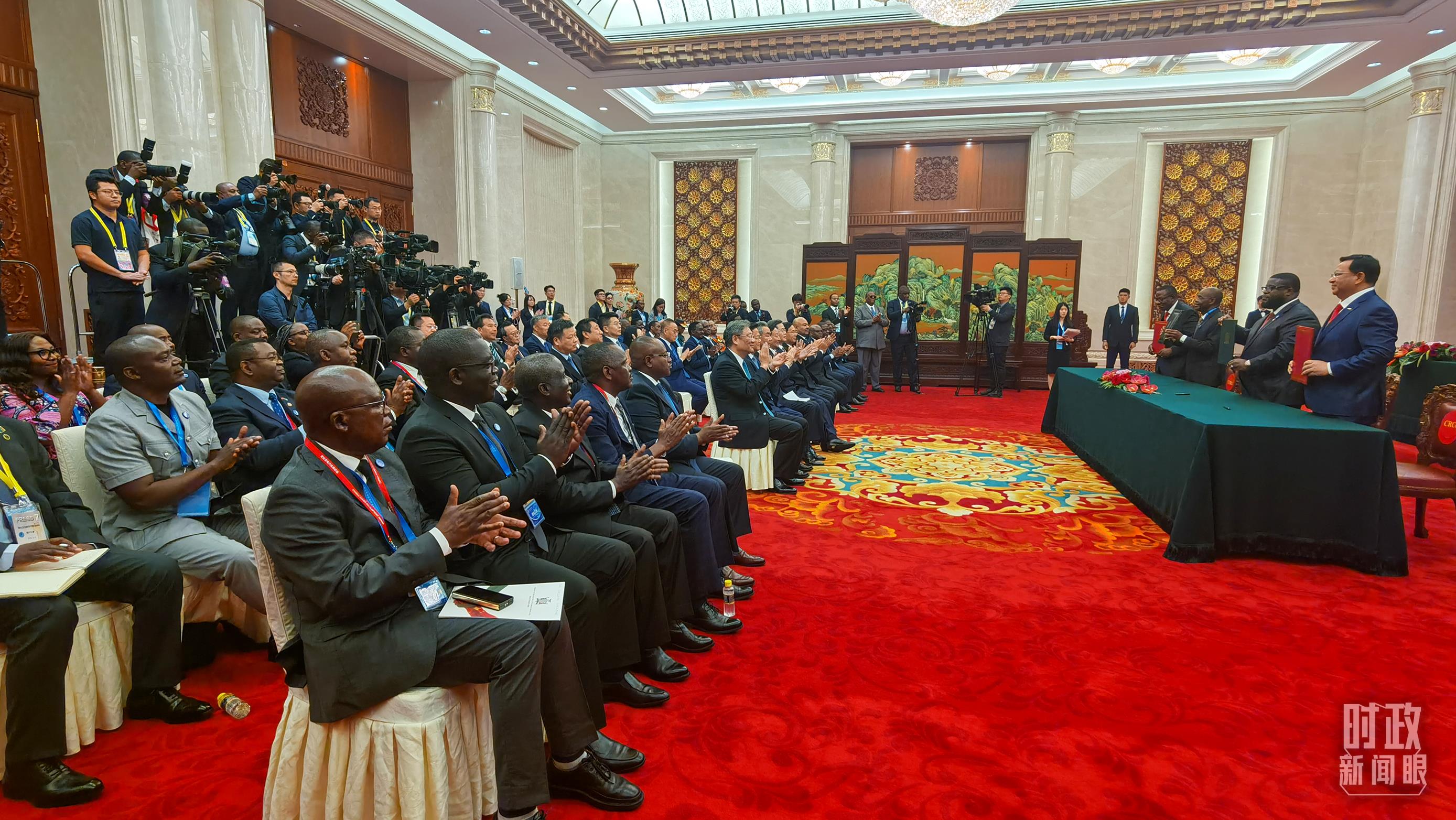 人民大會堂北大廳,中國國旗和中非合作論壇成員國國旗以及非洲聯(lián)盟旗幟交相輝映,巨幅蘇繡壁畫《長城》氣勢恢宏。
