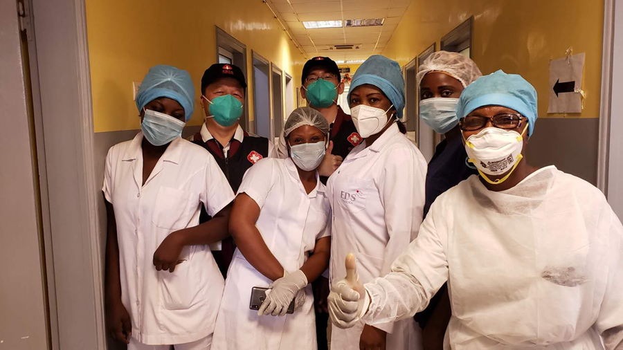 2020年5月26日,中國抗疫醫(yī)療專家組在剛果(布)首都布拉柴維爾指導新冠肺炎病房建設時,與當?shù)匾痪€醫(yī)務人員合影。新華社發(fā)
