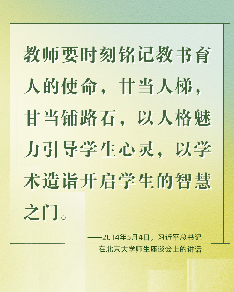 他們帶領(lǐng)學(xué)生前行,更新舊知、開(kāi)掘新知、探索未知;他們肩負(fù)光榮使命,為黨育人、為國(guó)育才、為民育未來(lái)。守教育報(bào)國(guó)初心、擔(dān)立德樹(shù)人使命、圓民族復(fù)興之夢(mèng),建設(shè)社會(huì)主義現(xiàn)代化強(qiáng)國(guó)之路上,教育家精神自當(dāng)念茲在茲、代代傳承、光芒永綻。