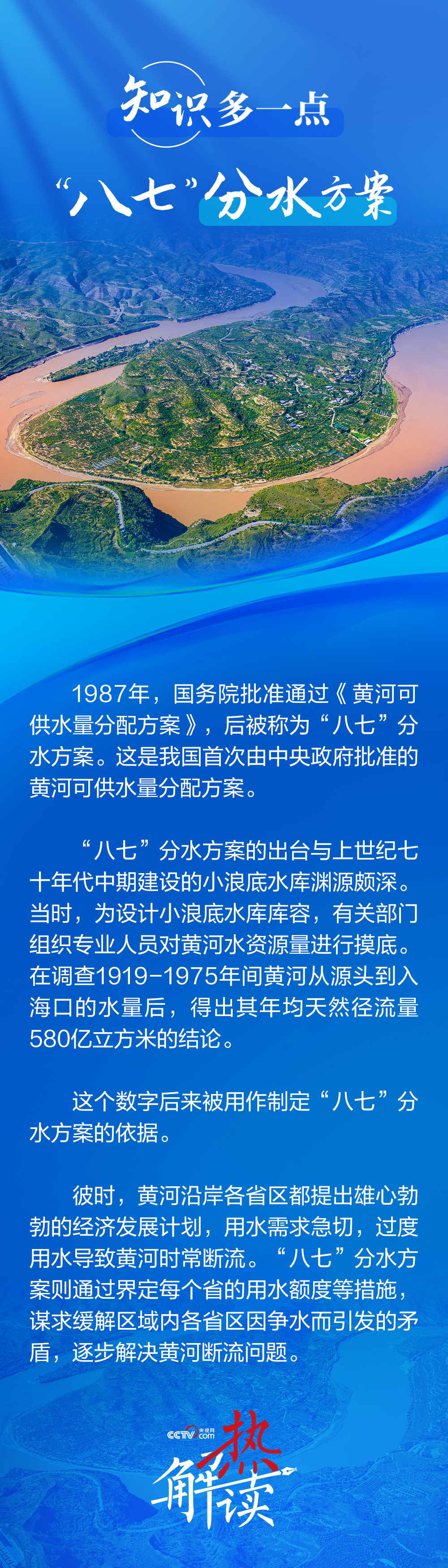 “八七”分水方案是上世紀(jì)八十年代我國批準(zhǔn)的黃河可供水量分配方案。該方案以1980年實(shí)際用水量為基準(zhǔn),綜合考慮了沿黃各省區(qū)的灌溉發(fā)展規(guī)模、工業(yè)和城市用水增長以及大中型水利工程興建等因素,來為沿黃各省區(qū)分配黃河用水權(quán)?!鞍似摺狈炙桨缸?987年國務(wù)院批復(fù)后沿用至今,未重新調(diào)整。