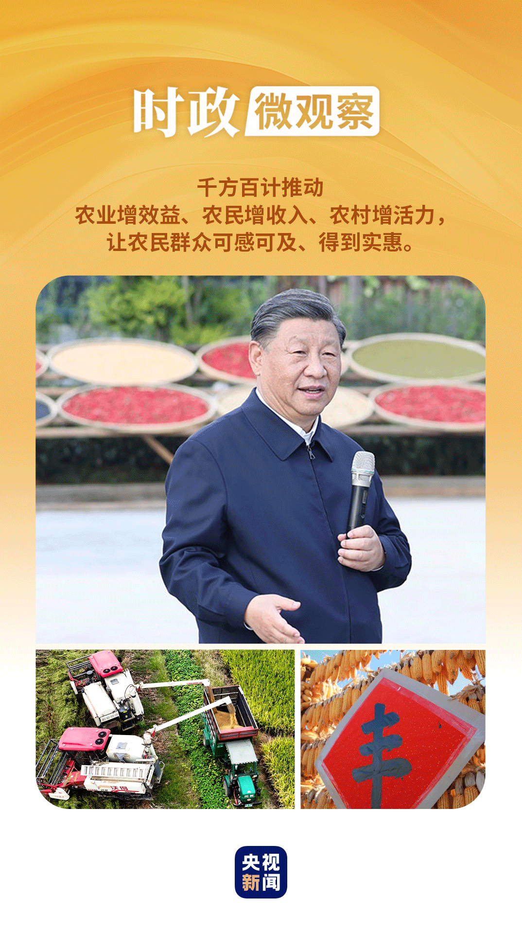 在第七個(gè)“中國農(nóng)民豐收節(jié)”到來之際,習(xí)近平總書記代表黨中央,向全國廣大農(nóng)民和工作在“三農(nóng)”戰(zhàn)線上的同志們致以節(jié)日祝賀和誠摯問候,對(duì)于堅(jiān)持不懈夯實(shí)農(nóng)業(yè)基礎(chǔ),推進(jìn)鄉(xiāng)村全面振興提出殷切期望和要求——