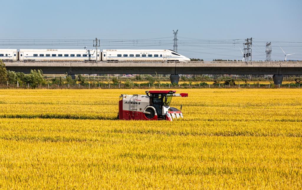 2024年9月18日,黑龍江省哈爾濱市阿城區(qū)料甸街道三家子屯,農(nóng)民正在收割水稻。