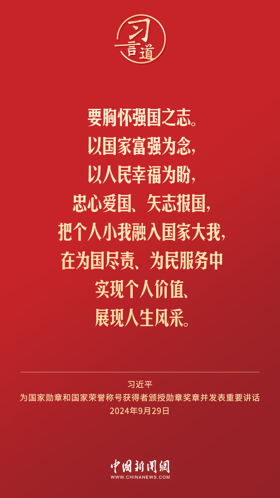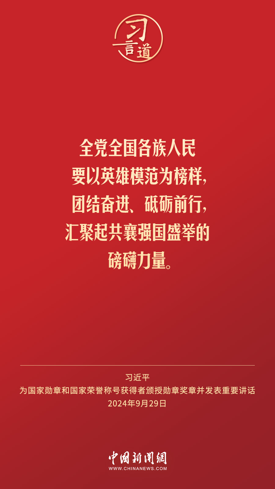 經(jīng)中共中央批準(zhǔn),中華人民共和國(guó)國(guó)家勛章和國(guó)家榮譽(yù)稱號(hào)頒授儀式于9月29日上午10時(shí)在人民大會(huì)堂隆重舉行。中共中央總書(shū)記、國(guó)家主席、中央軍委主席習(xí)近平向國(guó)家勛章和國(guó)家榮譽(yù)稱號(hào)獲得者分別授予“共和國(guó)勛章”“友誼勛章”和國(guó)家榮譽(yù)稱號(hào)獎(jiǎng)?wù)虏l(fā)表重要講話。習(xí)近平指出——