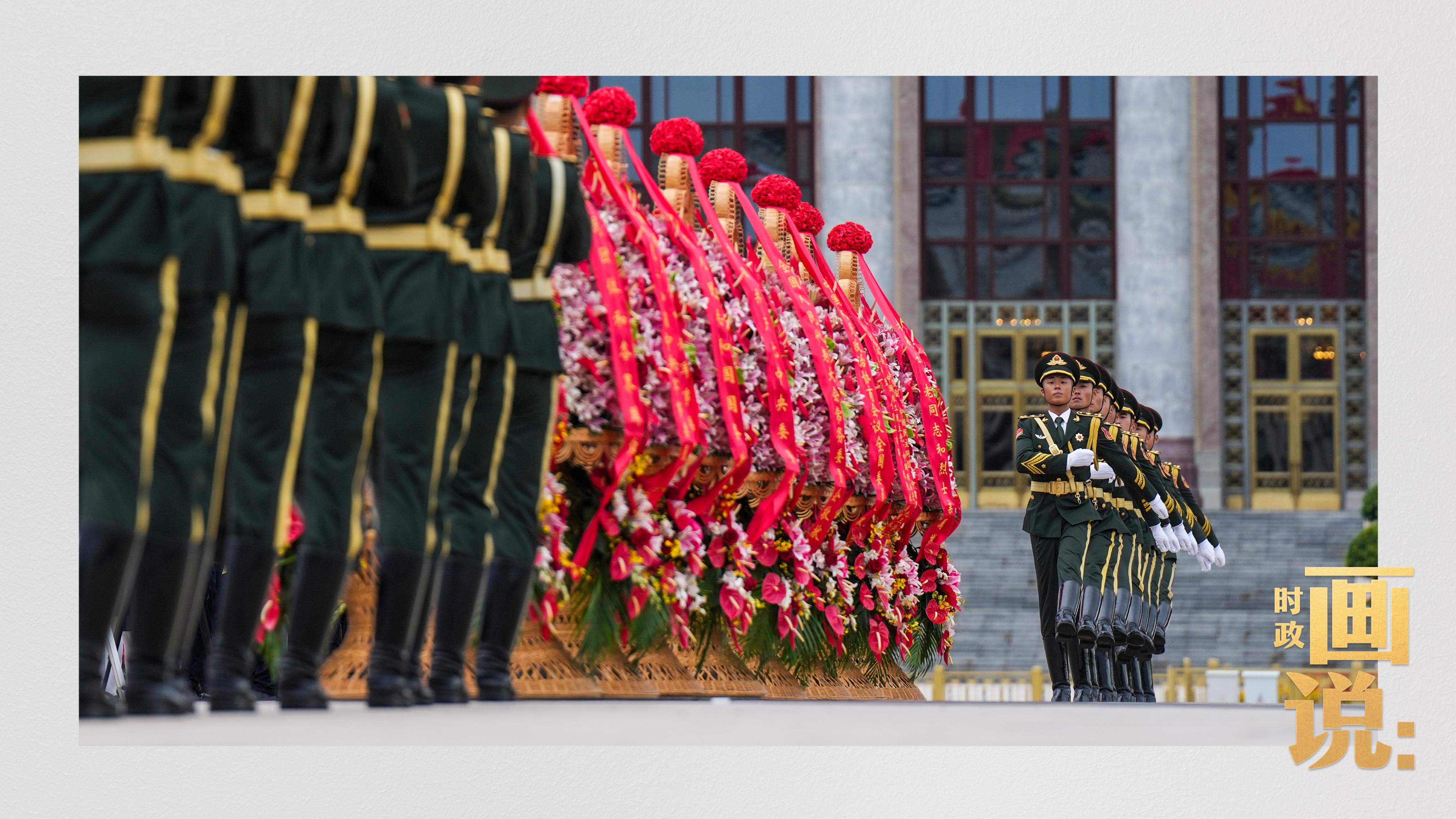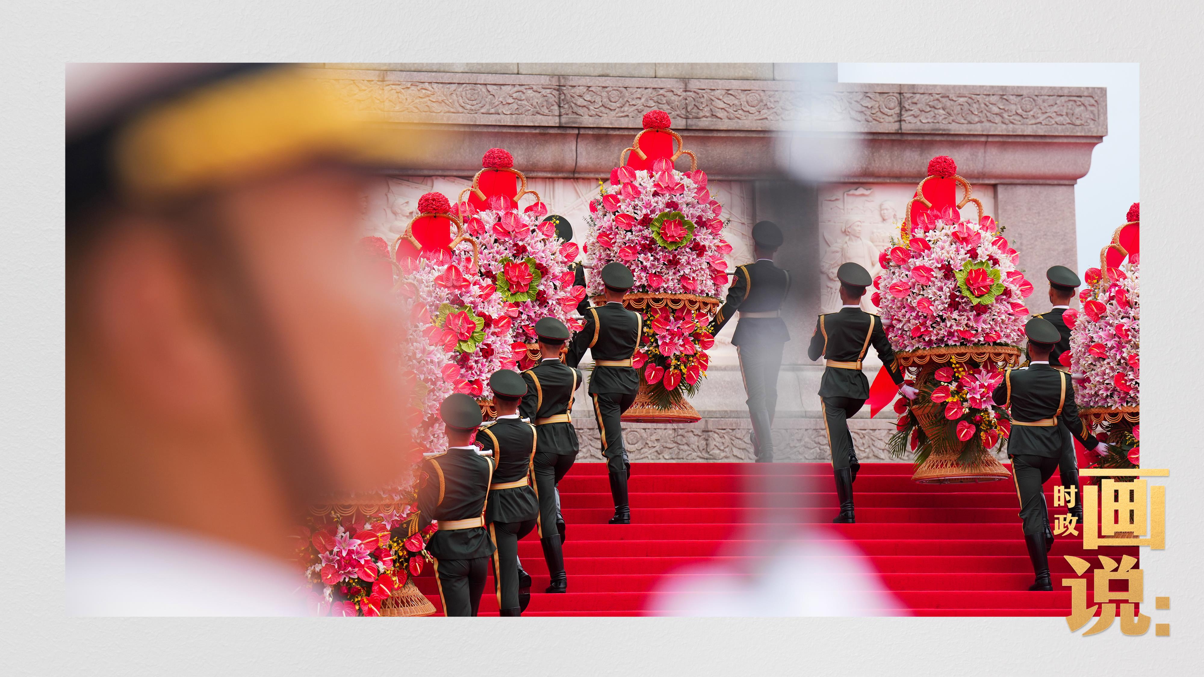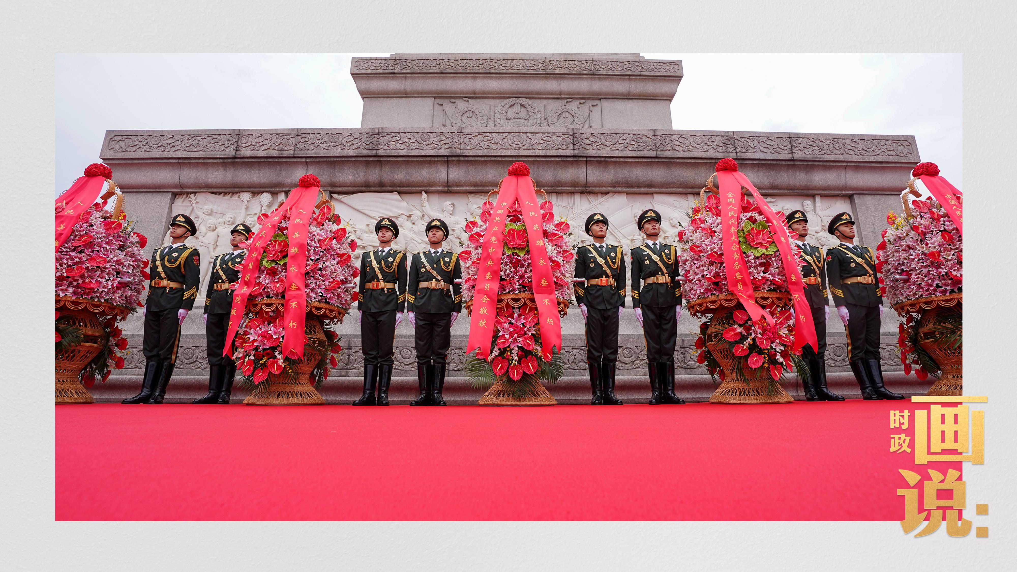 禮兵抬起花籃,緩步走向人民英雄紀(jì)念碑。