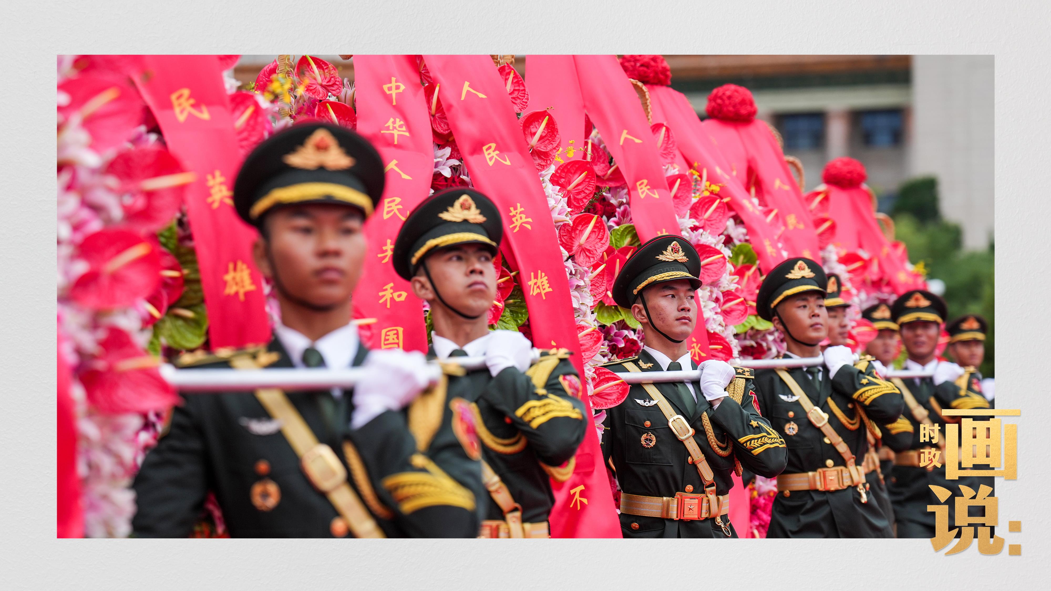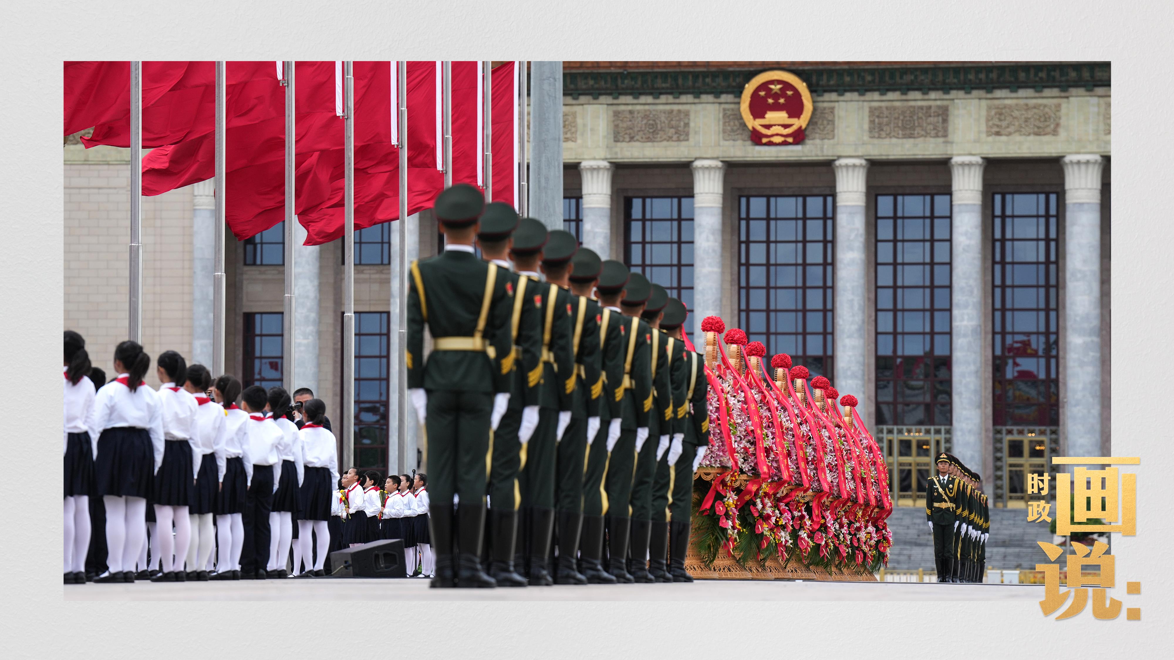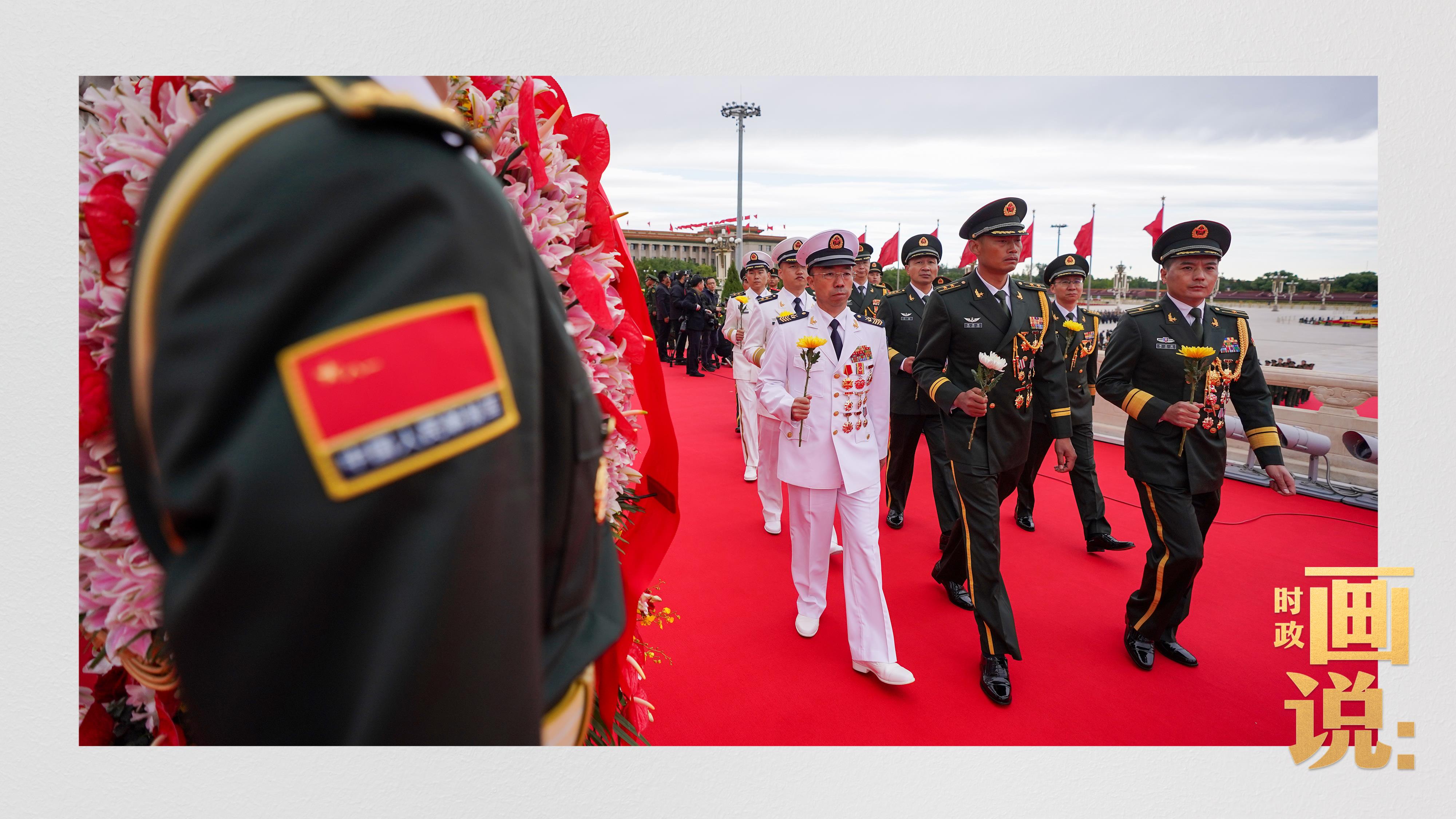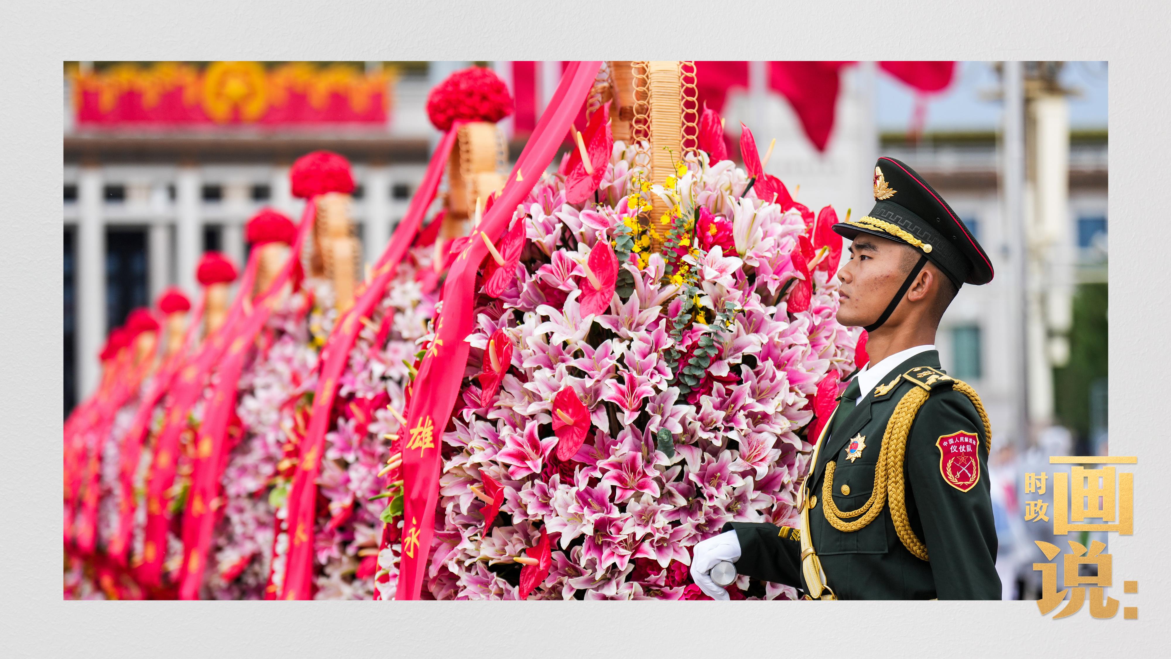 禮兵抬起花籃,緩步走向人民英雄紀(jì)念碑。