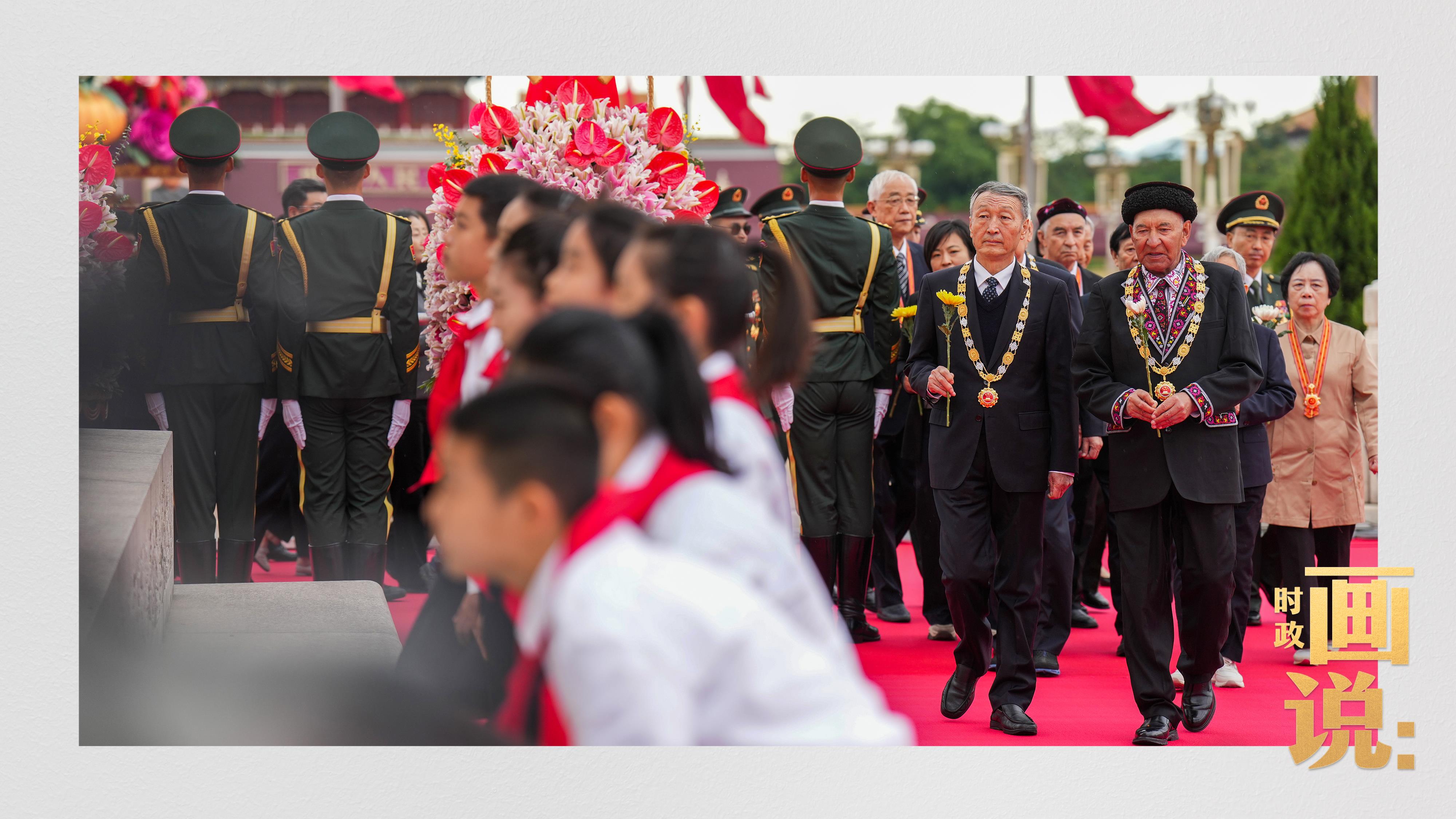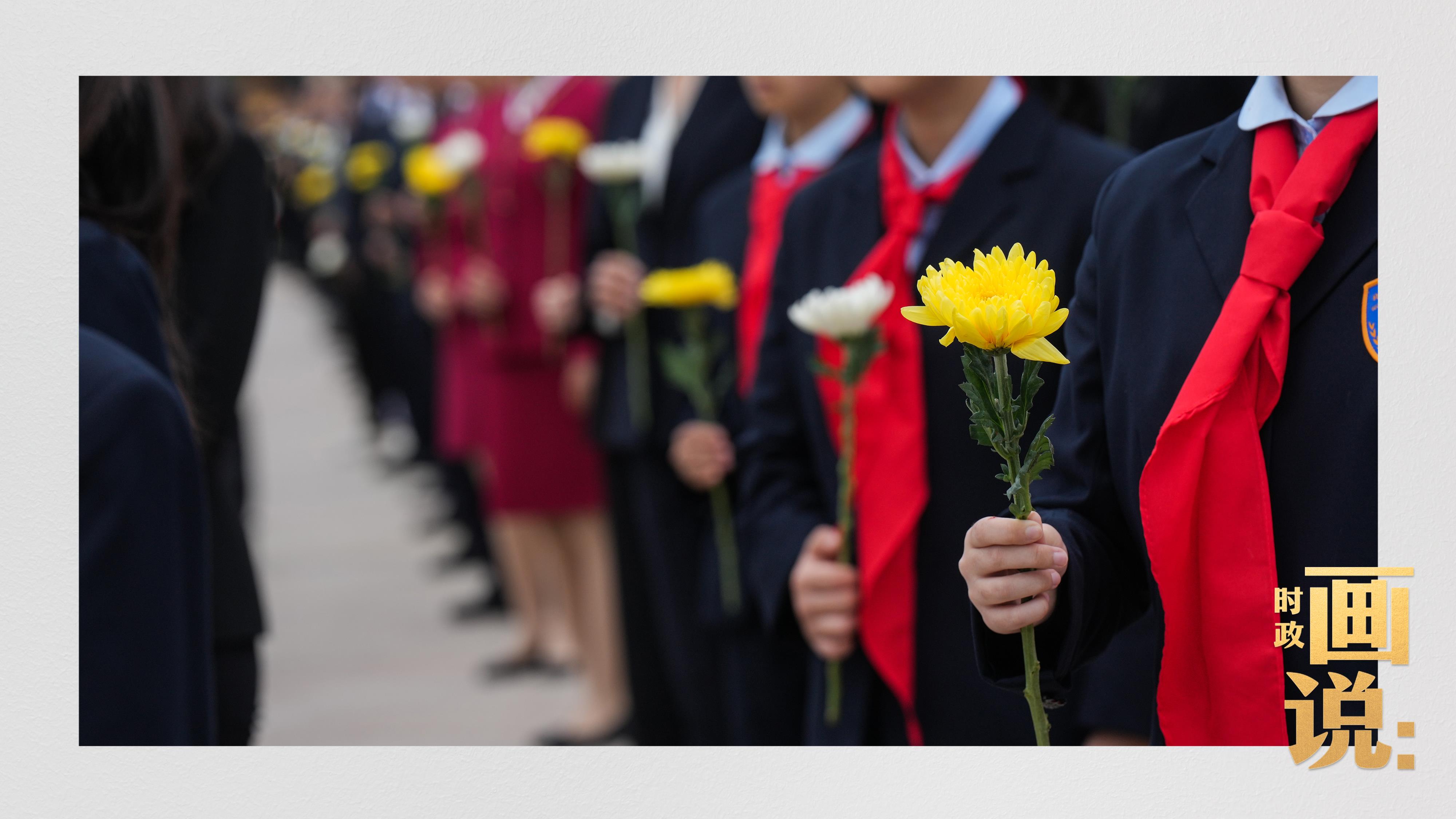 少年兒童和各界代表依次走到紀(jì)念碑前,獻(xiàn)上手中鮮花并瞻仰紀(jì)念碑。