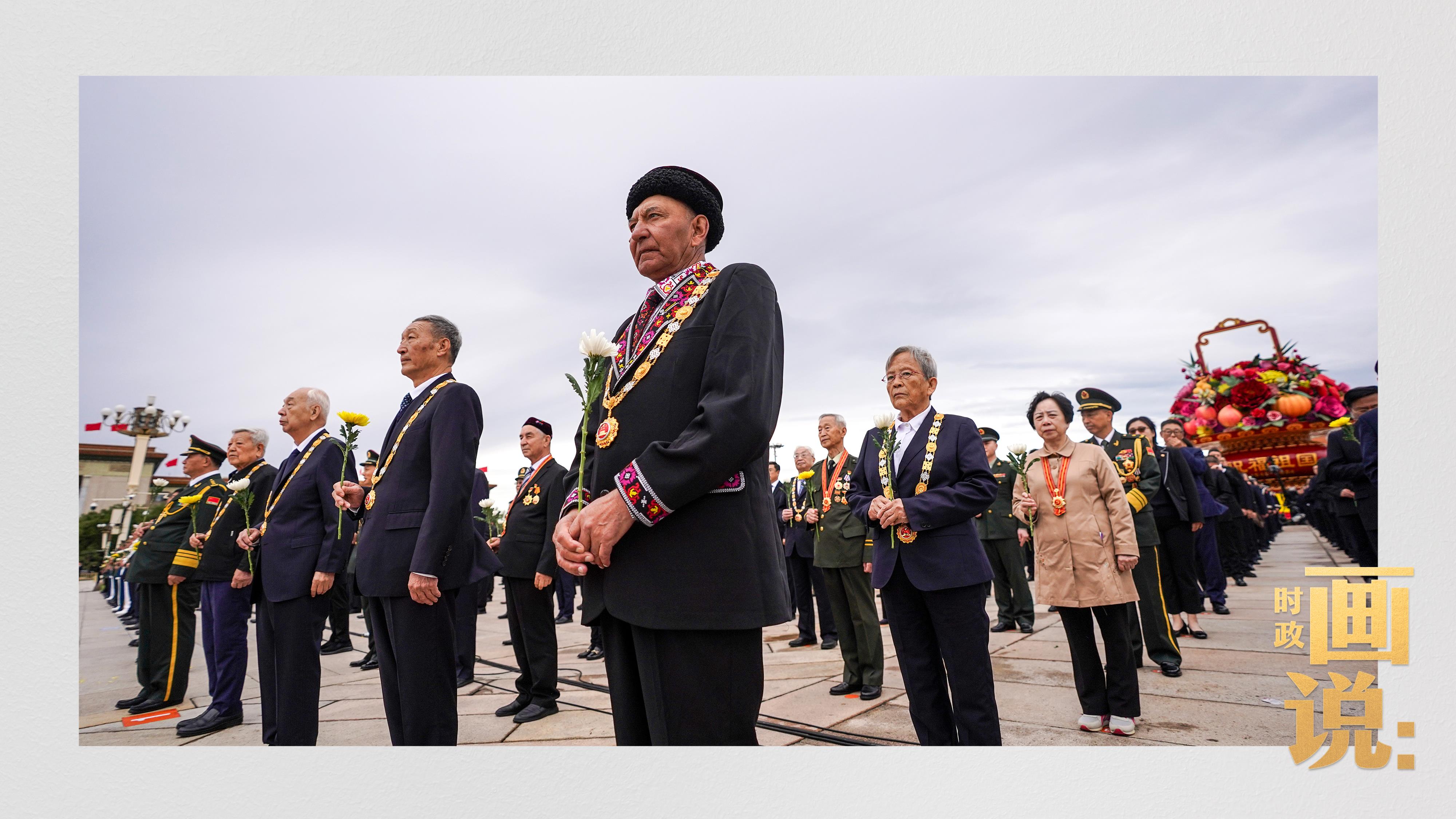 手持鮮花的少年兒童面向人民英雄紀(jì)念碑高唱《我們是共產(chǎn)主義接班人》。