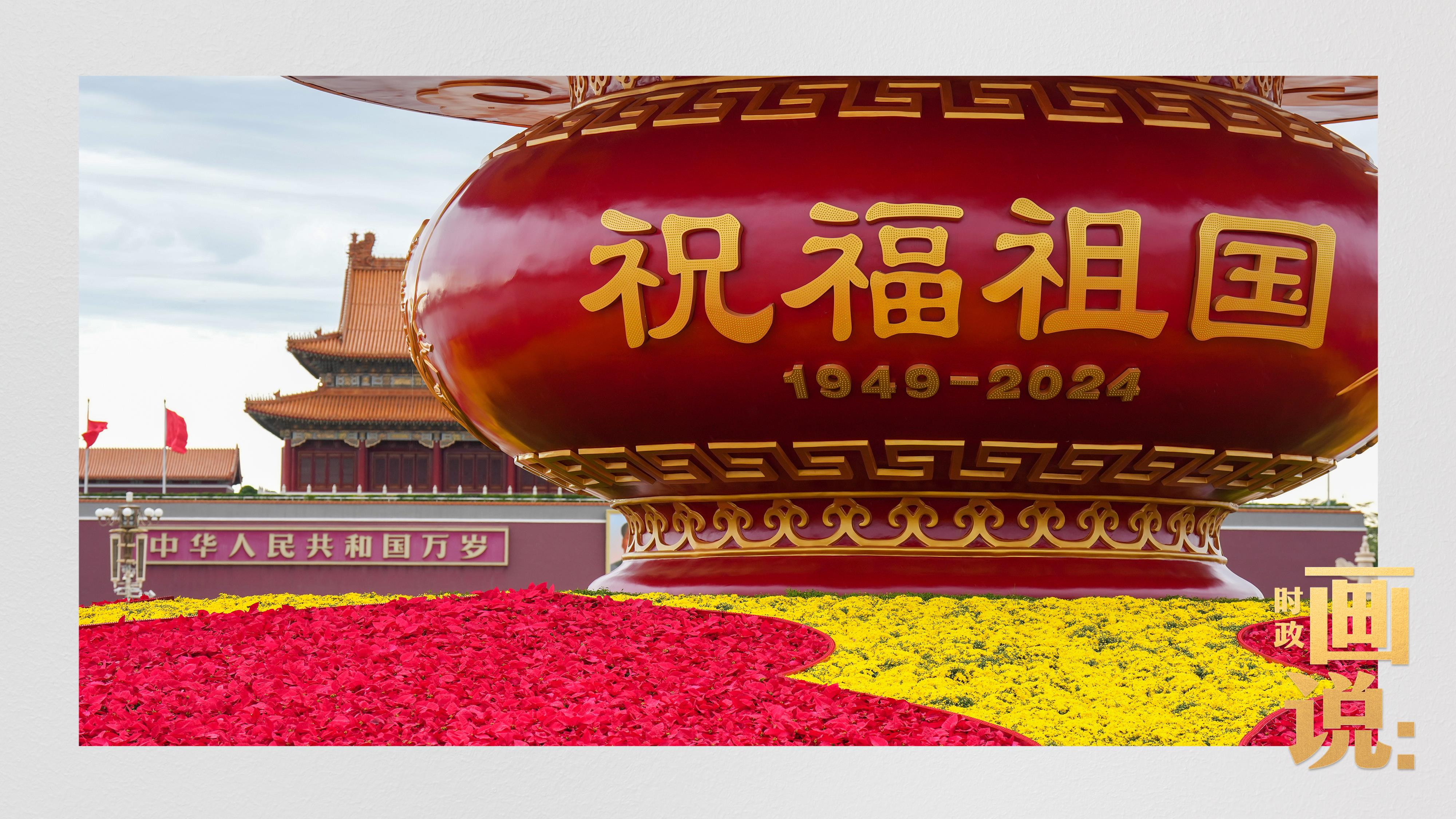 天安門廣場中央,“祝福祖國”巨型花籃表達(dá)著對國家繁榮富強(qiáng)的美好祝福。
