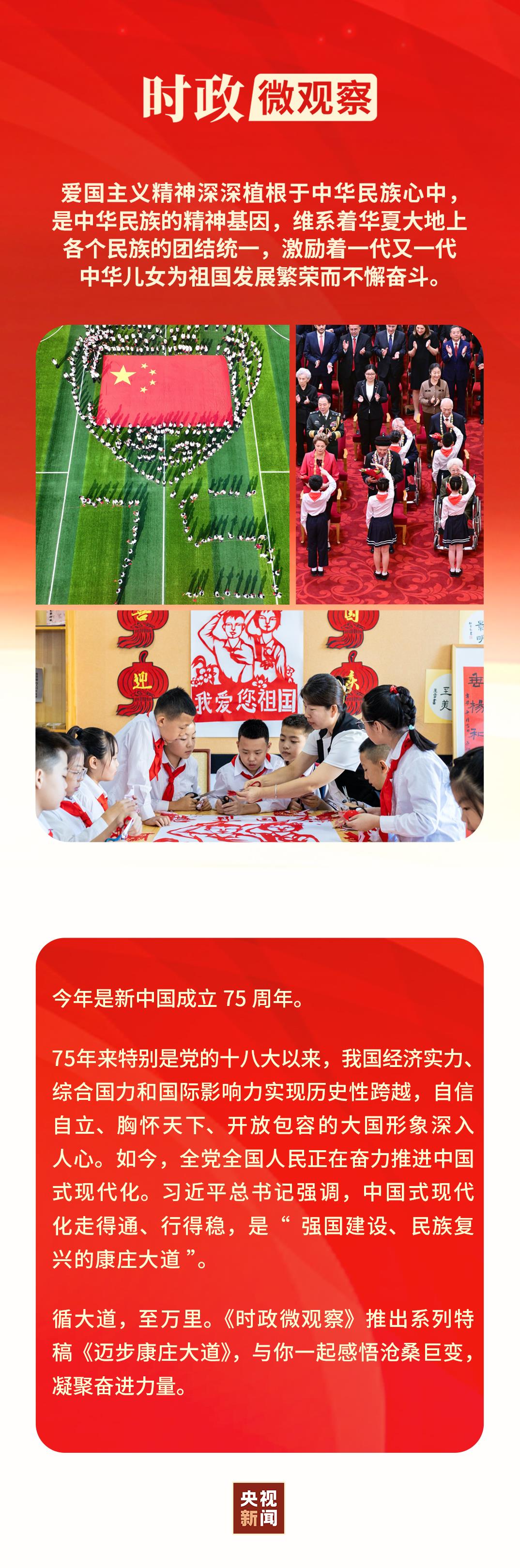 實(shí)現(xiàn)中華民族偉大復(fù)興的中國夢,是當(dāng)代中國愛國主義的鮮明主題。新征程上,我們要凝聚起心中的愛國情、強(qiáng)國志,勠力同心、開拓進(jìn)取,共同譜寫人民共和國更加絢麗精彩的新篇章。