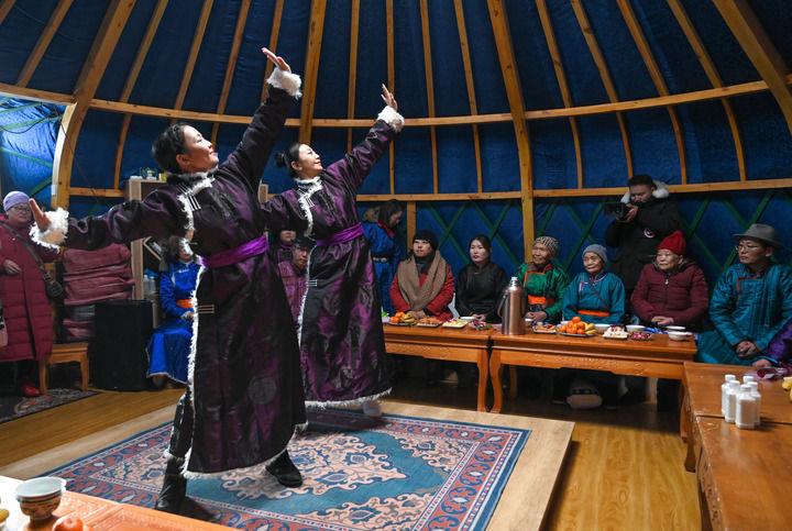 2023年12月21日,烏蘭牧騎隊員在內(nèi)蒙古阿其圖烏拉蘇木進(jìn)行舞蹈表演。
