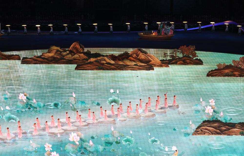 2023年9月23日,演員在杭州亞運(yùn)會開幕式上表演。《千里江山圖》和《富春山居圖》兩幅國寶級名畫,通過數(shù)字技術(shù),成為移動的山水。