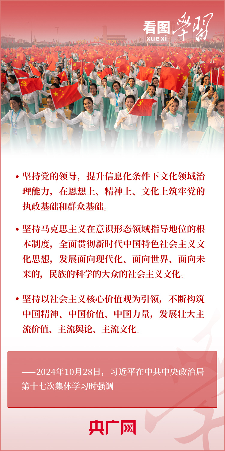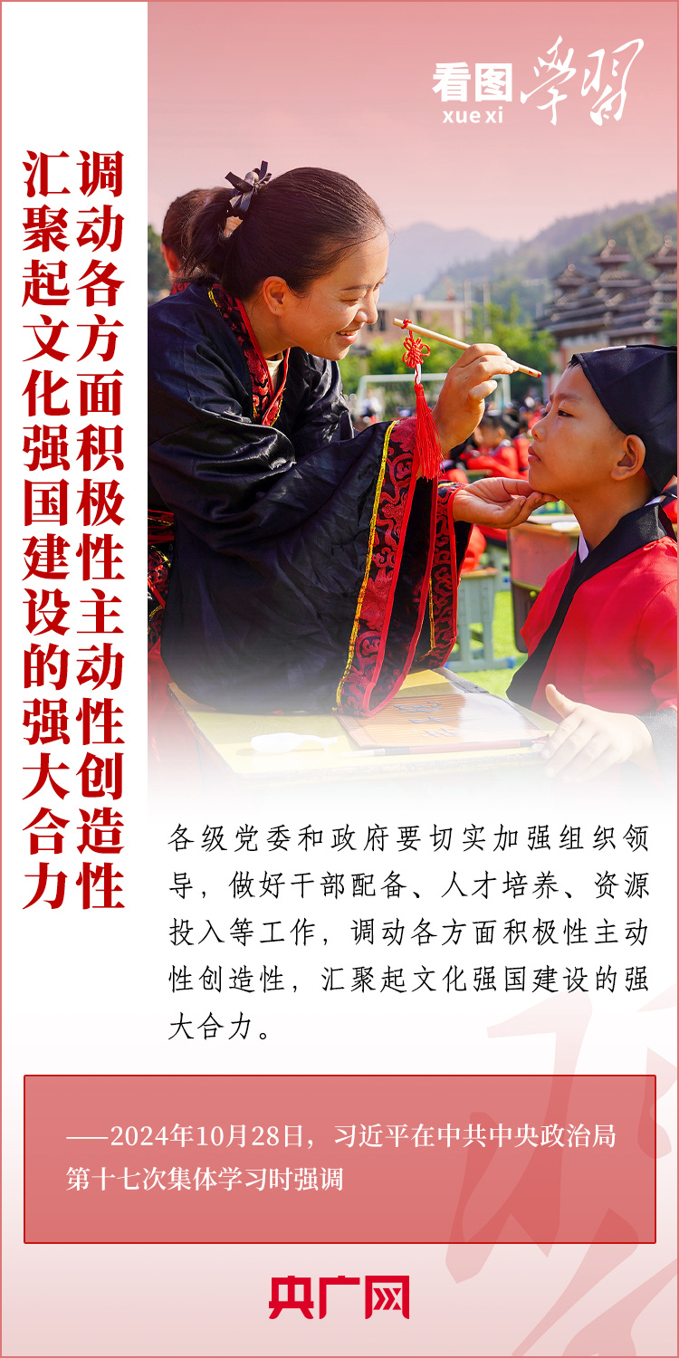 建設(shè)文化強(qiáng)國是全黨全社會的共同任務(wù)。10月28日,中共中央政治局就建設(shè)文化強(qiáng)國進(jìn)行第十七次集體學(xué)習(xí)。習(xí)近平總書記在聽取講解和討論后發(fā)表重要講話,就錨定2035年建成文化強(qiáng)國戰(zhàn)略目標(biāo)作出最新部署,強(qiáng)調(diào)要“不斷發(fā)展具有強(qiáng)大思想引領(lǐng)力、精神凝聚力、價(jià)值感召力、國際影響力的新時(shí)代中國特色社會主義文化,不斷增強(qiáng)人民精神力量,筑牢強(qiáng)國建設(shè)、民族復(fù)興的文化根基?!币黄饋韺W(xué)習(xí)!