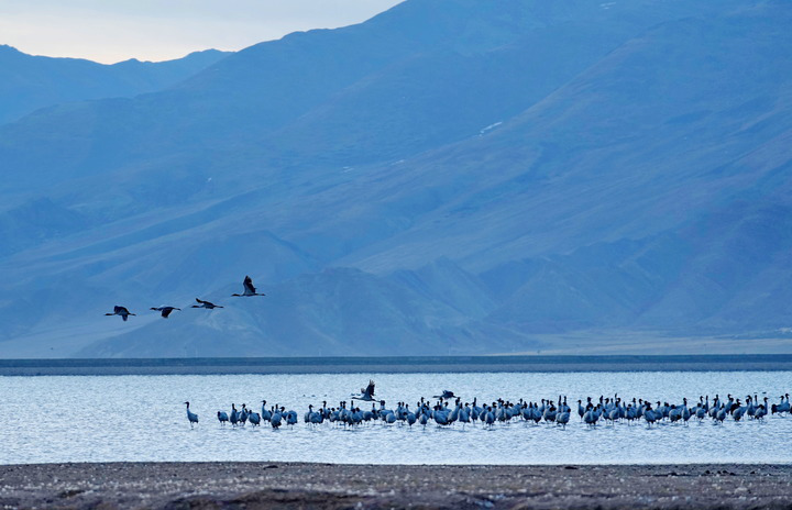 在雅魯藏布江中游河谷黑頸鶴國(guó)家級(jí)自然保護(hù)區(qū),黑頸鶴飛翔在一片水域上空(2024年3月17日攝)。多年來(lái),西藏各級(jí)黨委政府和對(duì)口援藏省市接續(xù)投入2.4億余元資金開展生態(tài)建設(shè),創(chuàng)設(shè)的雅江北岸南木林生態(tài)示范區(qū)已完成造林4萬(wàn)多畝,昔日戈壁荒灘漸變江畔綠洲,也成了黑頸鶴越冬的理想棲息地。監(jiān)測(cè)數(shù)據(jù)顯示,西藏境內(nèi)的黑頸鶴種群數(shù)量持續(xù)增長(zhǎng),已由上世紀(jì)的不足3000只增長(zhǎng)到目前的1萬(wàn)余只。