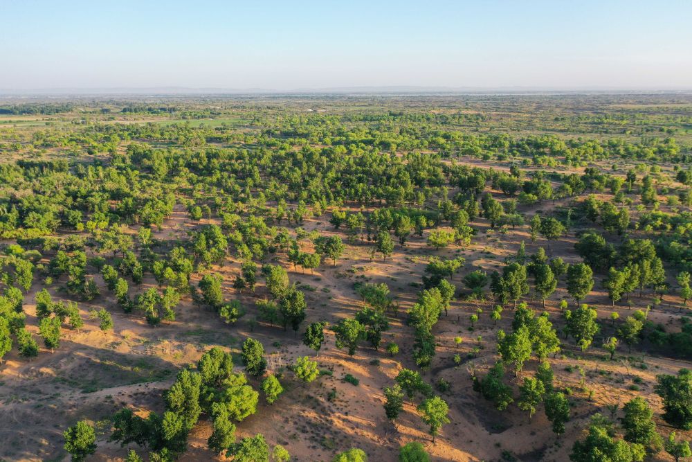 2023年6月14日在內(nèi)蒙古毛烏素沙地拍攝的當(dāng)?shù)啬撩穹N植的一片樹林(無(wú)人機(jī)照片)。2024年以來(lái),內(nèi)蒙古全面開展“三北”工程攻堅(jiān)戰(zhàn),已完成防沙治沙面積約1954萬(wàn)畝,約為年度總?cè)蝿?wù)1730萬(wàn)畝的113%,超額完成年度任務(wù)。