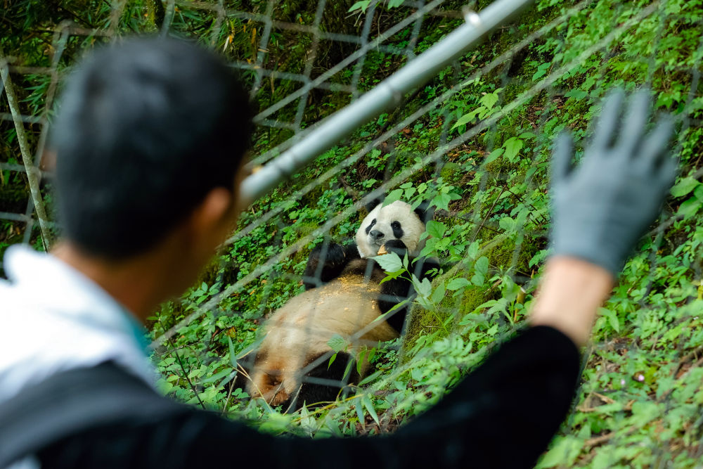 2024年6月24日,在位于大熊貓國(guó)家公園臥龍片區(qū)內(nèi)天臺(tái)山的大熊貓第二階段野化培訓(xùn)場(chǎng)外,工作人員給母熊貓“賢賢”投喂完食物后揮手向其告別。近年來(lái),我國(guó)通過(guò)大力實(shí)施天然林保護(hù)、野生動(dòng)植物保護(hù)和大熊貓國(guó)家公園建設(shè)等,保護(hù)大熊貓及其棲息地,成效顯著。大熊貓野外種群總量已從20世紀(jì)80年代的約1100只增長(zhǎng)到近1900只。