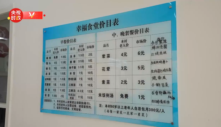 隨行記者用鏡頭記錄了這樣一幕:站在養(yǎng)老服務(wù)驛站幸福食堂價(jià)目表前,總書(shū)記仔細(xì)察看當(dāng)天菜單。菜單中既有種類豐富的早餐,也有六菜兩湯的中、晚套餐,葷素搭配、營(yíng)養(yǎng)均衡;村中老人用餐還有特別優(yōu)惠,另外還有免費(fèi)的稀飯和米飯例湯……