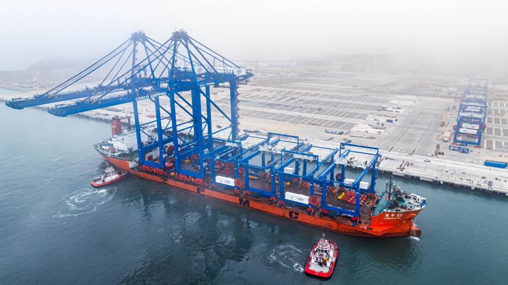 6月27日,岸邊集裝箱起重機(jī)和軌道吊運(yùn)抵秘魯錢凱港。新華社發(fā)(上海振華重工供圖)