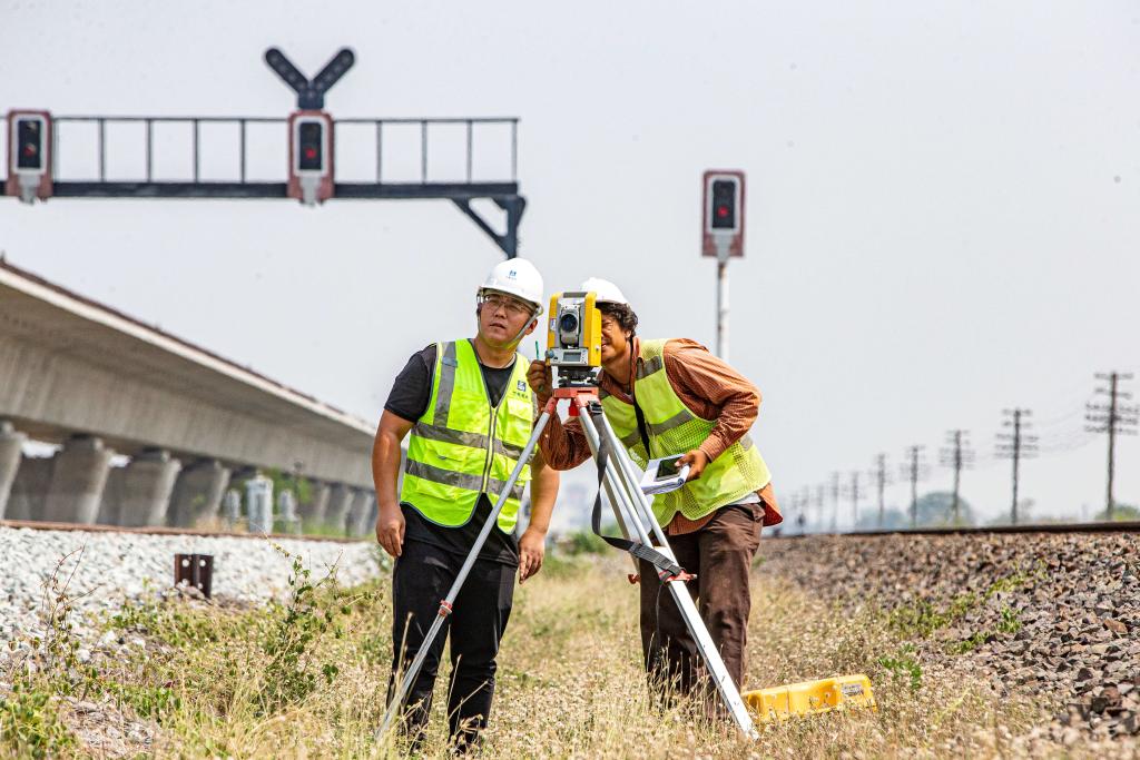 5月1日,在泰國(guó)大城府,中泰高鐵項(xiàng)目工作人員在施工現(xiàn)場(chǎng)勘查。新華社記者王騰攝