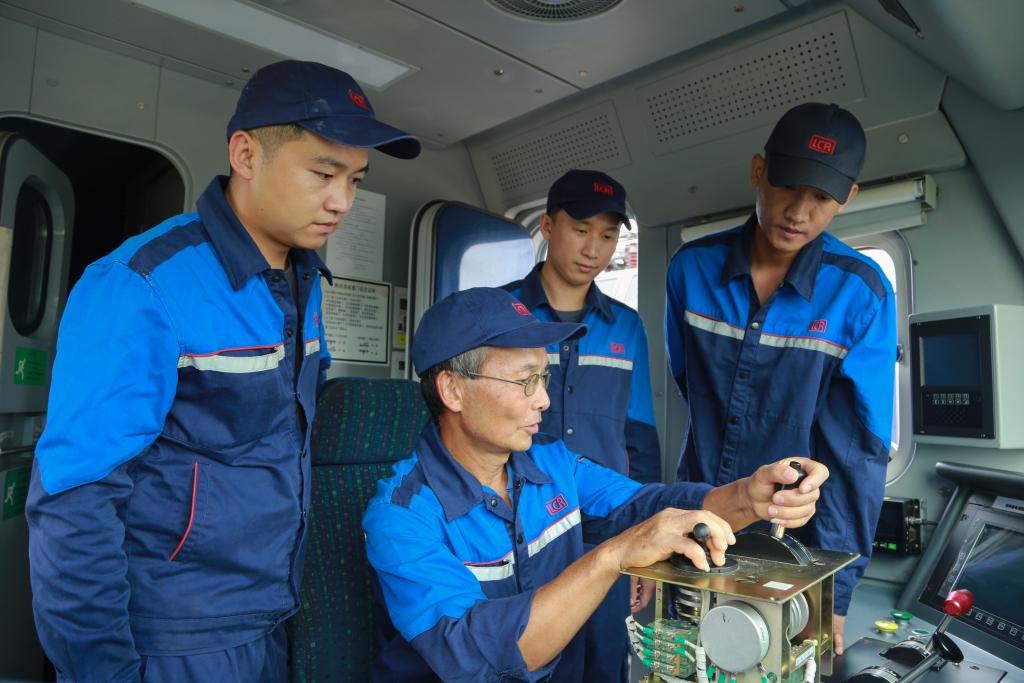 在中老鐵路萬(wàn)象運(yùn)營(yíng)管理中心的機(jī)車檢修庫(kù)里,中老師徒4人一同對(duì)機(jī)車部件進(jìn)行攻關(guān)(2024年9月9日攝)。新華社發(fā)(鄭皓文攝)