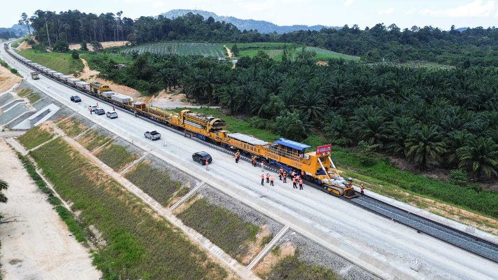 這是5月6日在馬來(lái)西亞彭亨州航拍的馬東鐵項(xiàng)目的鋪軌現(xiàn)場(chǎng)。新華社記者程一恒攝
