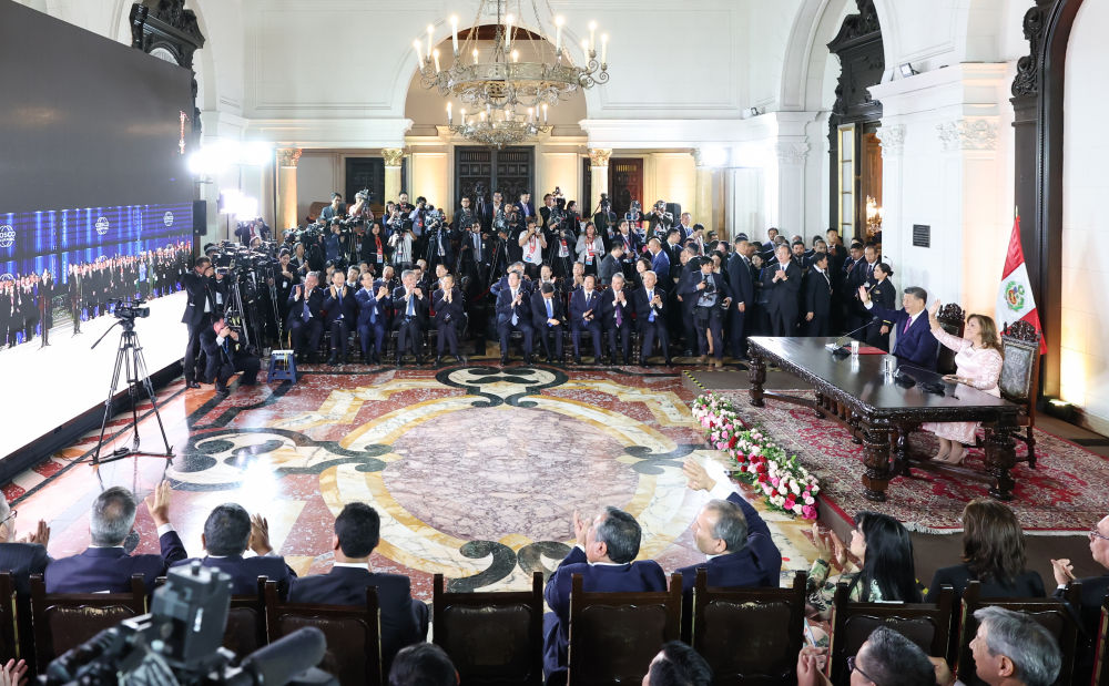 當(dāng)?shù)貢r(shí)間11月14日晚7時(shí)許,秘魯首都利馬總統(tǒng)府一層埃萊斯普魯廳,燈火通明,氣氛熱烈。習(xí)近平主席同秘魯總統(tǒng)博魯阿爾特以視頻方式共同出席秘魯錢凱港開港儀式。