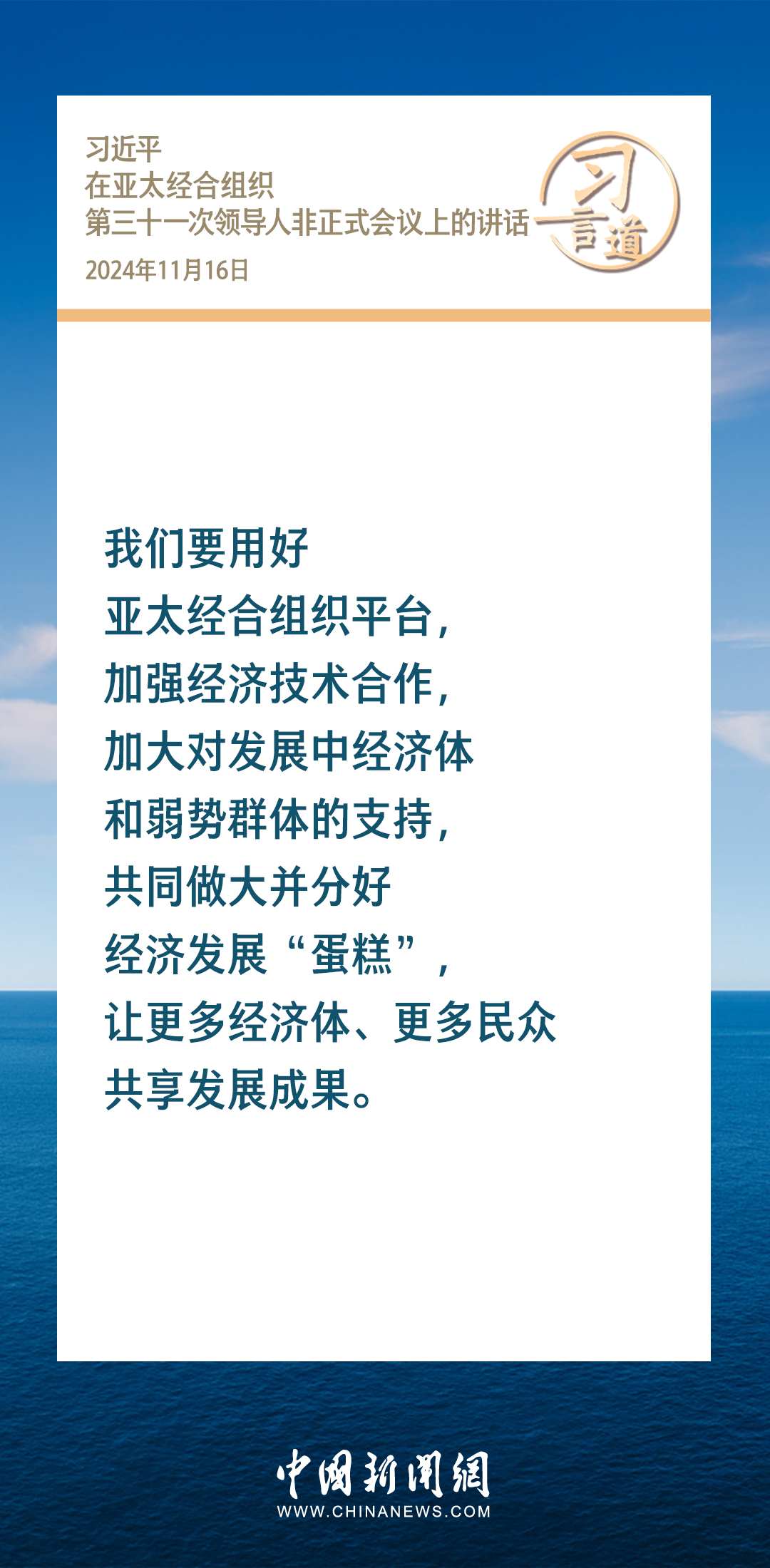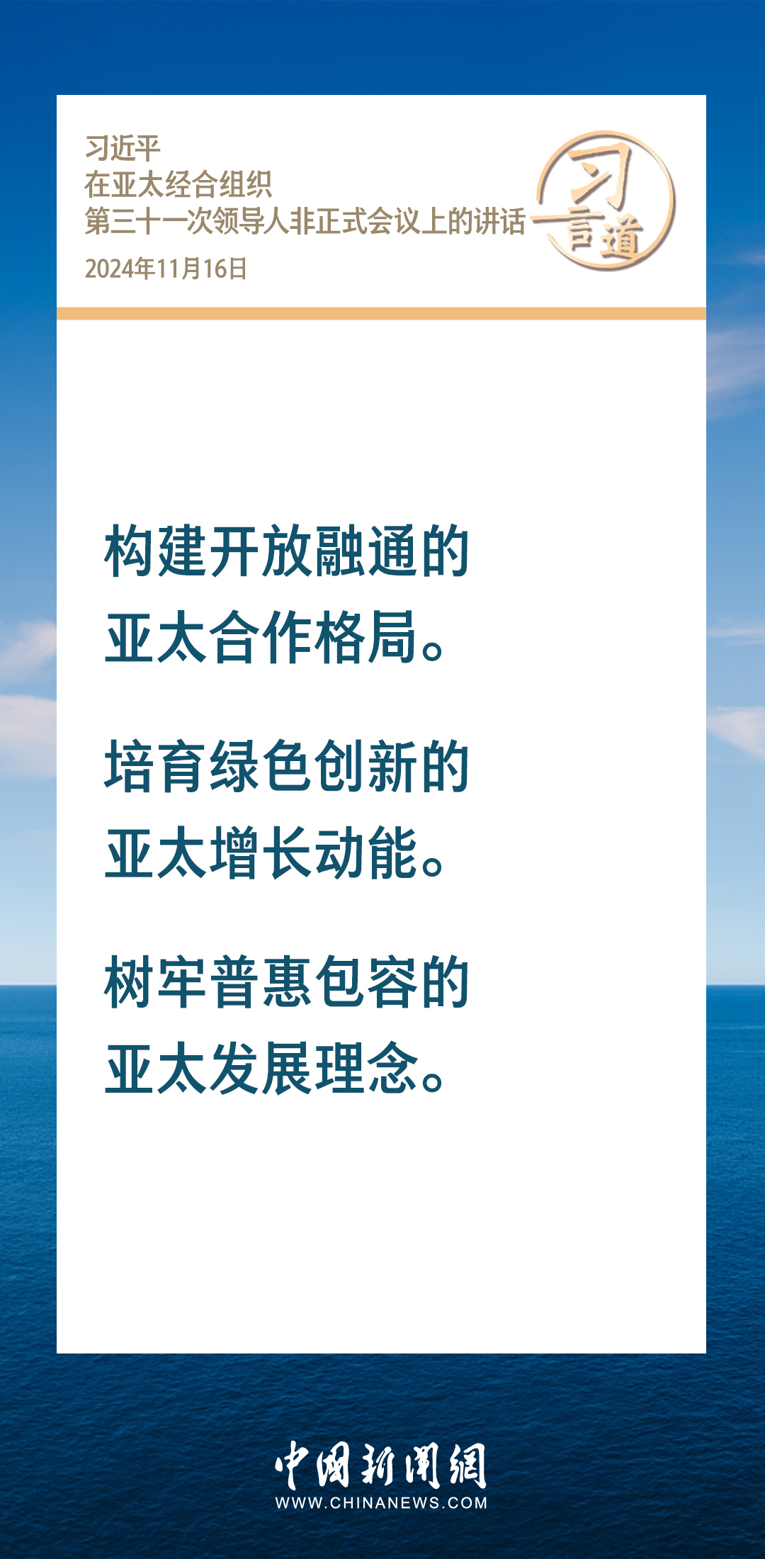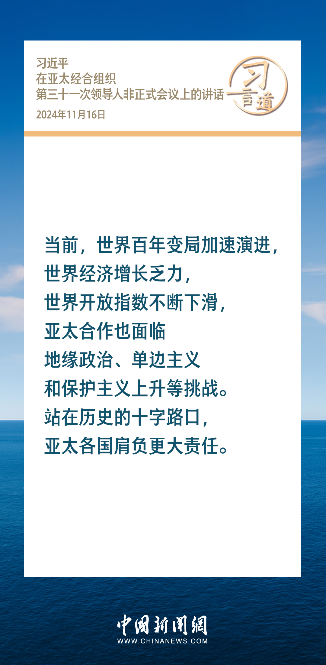 當(dāng)?shù)貢r間11月16日,國家主席習(xí)近平出席亞太經(jīng)合組織第三十一次領(lǐng)導(dǎo)人非正式會議并發(fā)表重要講話。習(xí)近平指出——