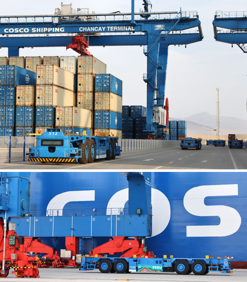 2024年11月14日,自動駕駛電動集裝箱卡車穿梭在秘魯錢凱港碼頭操作區(qū)。