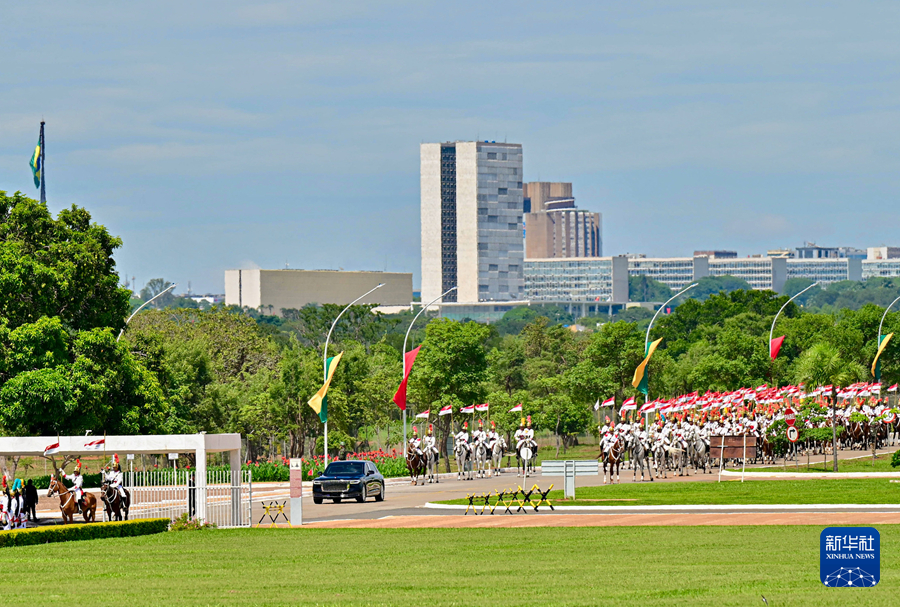 初夏時(shí)節(jié)的巴西利亞,天朗氣清。黎明宮內(nèi),綠草如茵,450名威武禮兵整齊列隊(duì)。在120名龍騎兵護(hù)衛(wèi)下,習(xí)近平乘車(chē)抵達(dá)黎明宮前廣場(chǎng)。