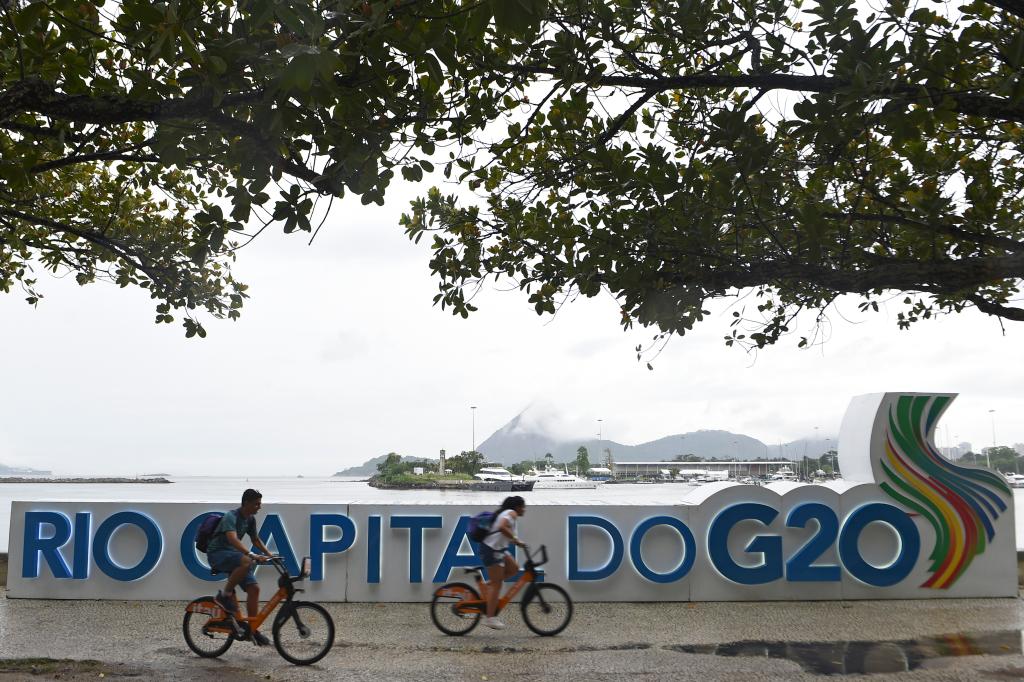 11月16日,在巴西里約熱內(nèi)盧,人們騎車經(jīng)過二十國集團領(lǐng)導(dǎo)人峰會舉辦地附近的峰會標(biāo)識。新華社發(fā)(盧西奧·塔沃拉攝)