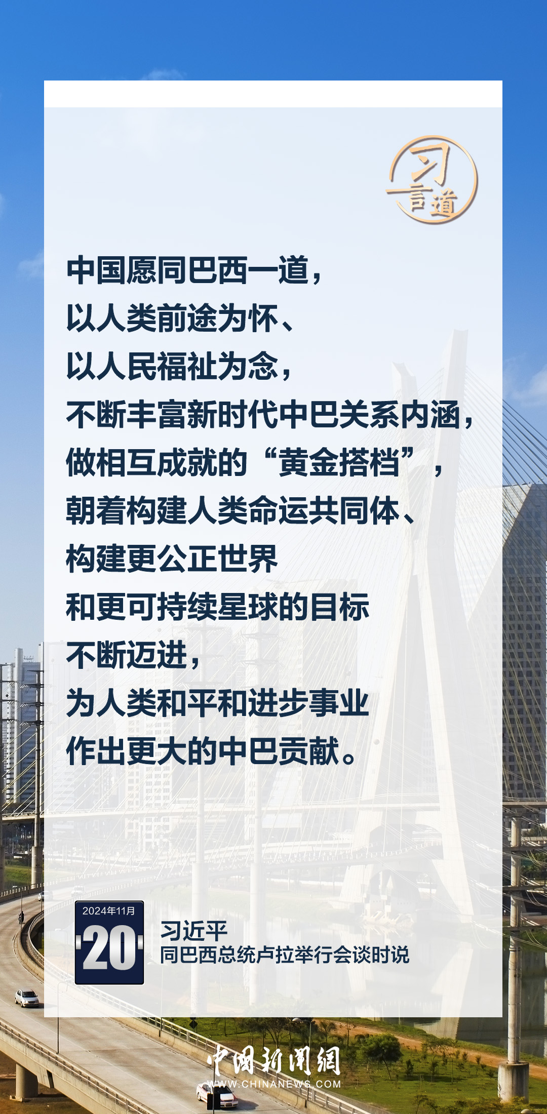 當(dāng)?shù)貢r間11月20日,中國國家主席習(xí)近平在巴西利亞總統(tǒng)官邸同巴西總統(tǒng)盧拉舉行會談。習(xí)近平指出——
