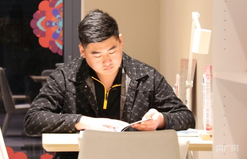 吳濤在共享圖書(shū)館看書(shū)(央廣網(wǎng)記者 唐奇云 攝)