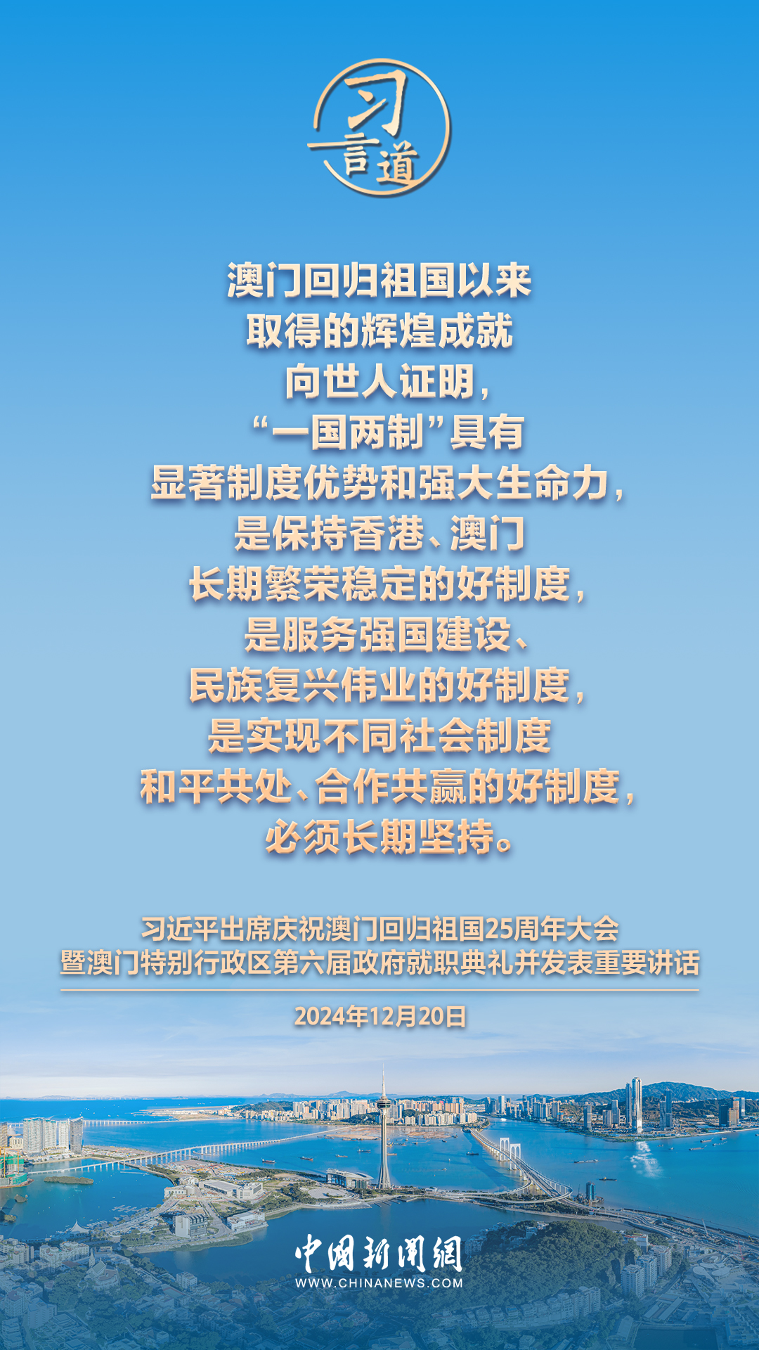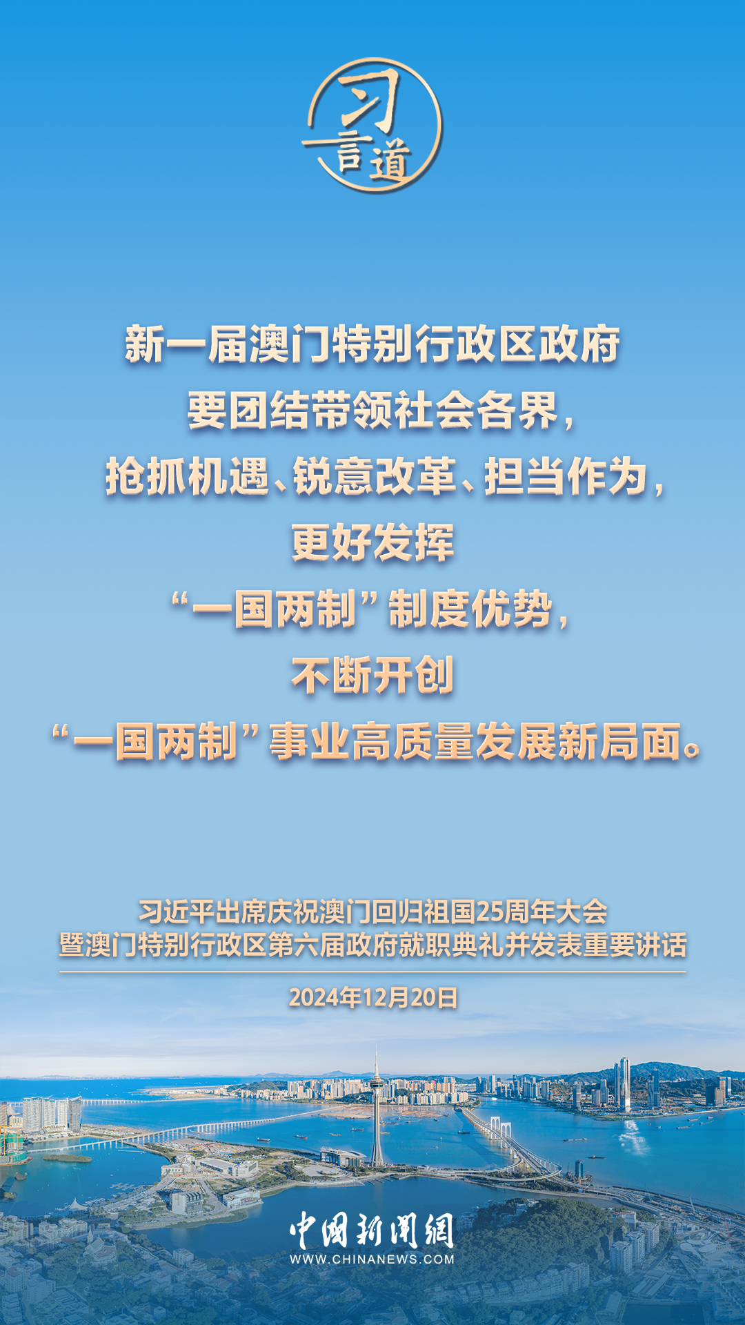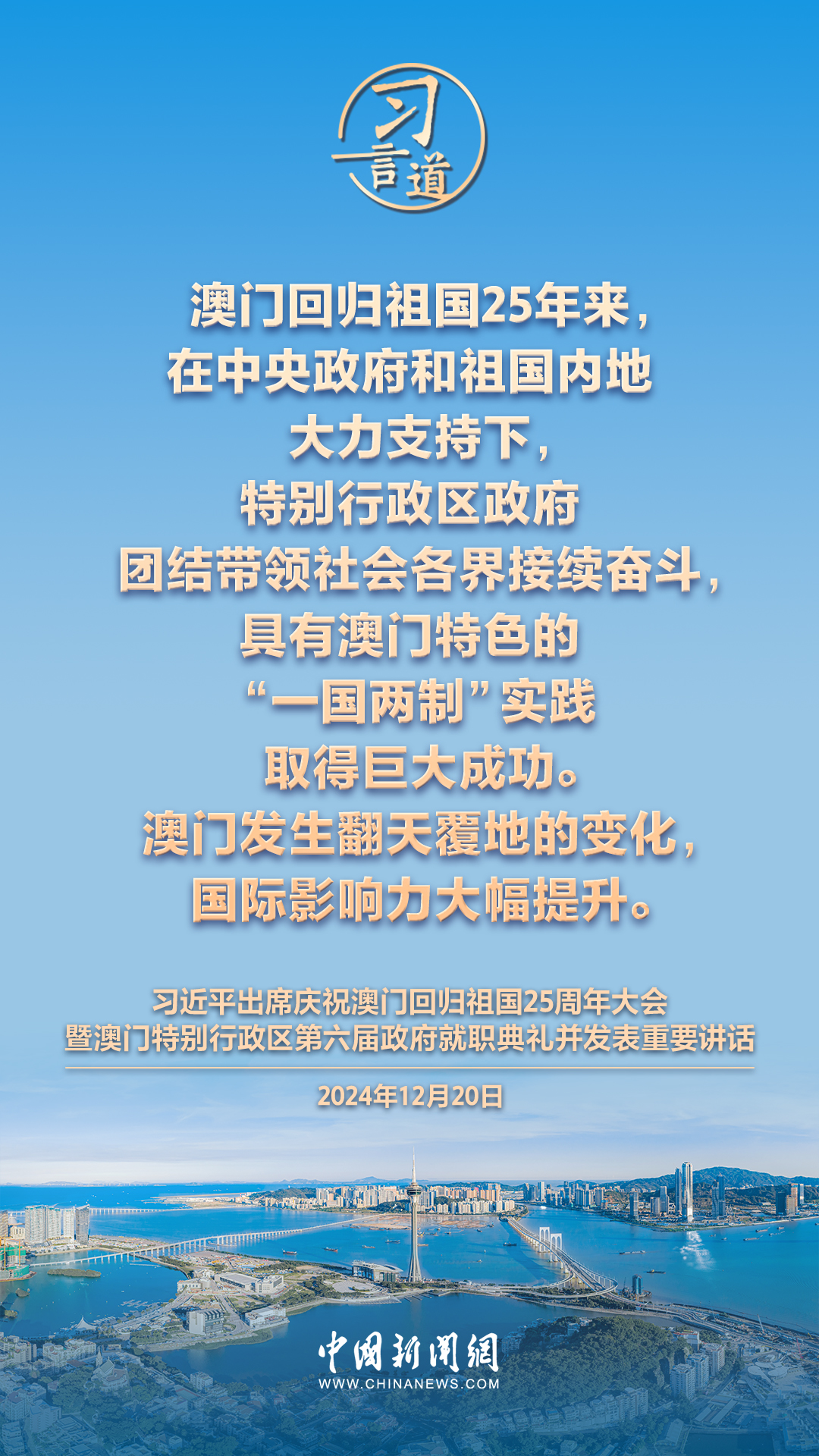 慶祝澳門回歸祖國25周年大會暨澳門特別行政區(qū)第六屆政府就職典禮20日在澳門東亞運動會體育館隆重舉行。中共中央總書記、國家主席、中央軍委主席習近平出席并發(fā)表重要講話,習近平指出——
